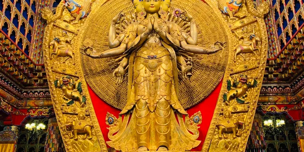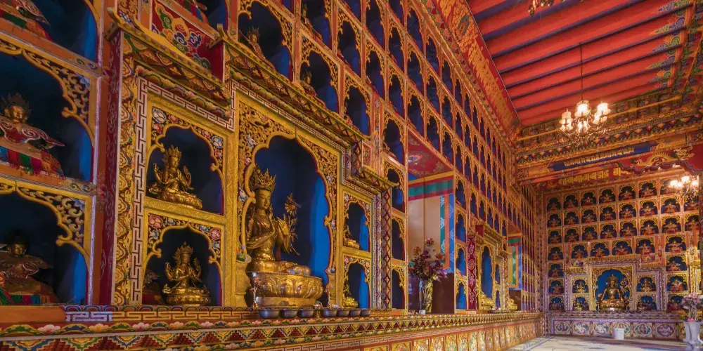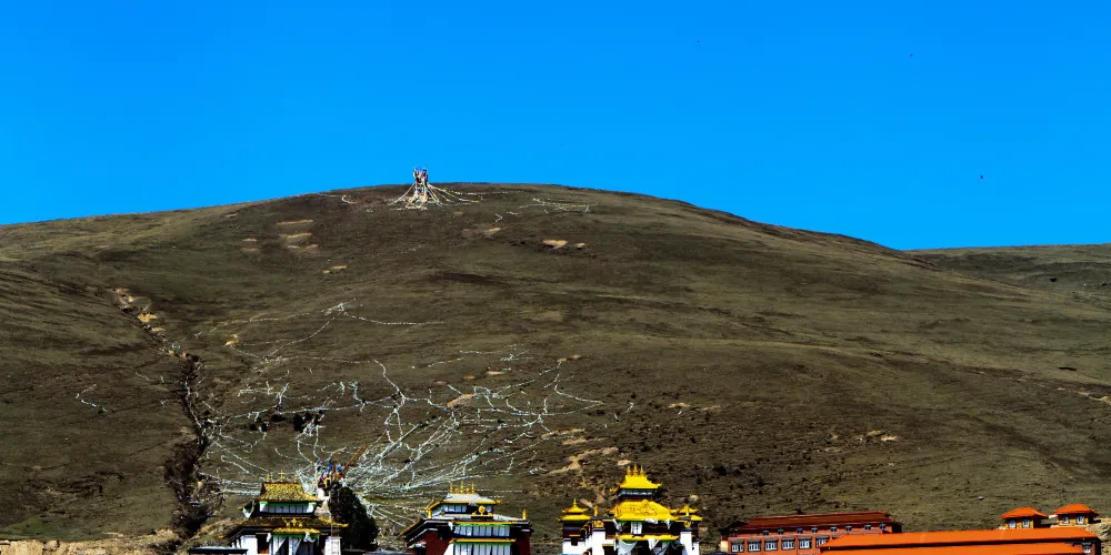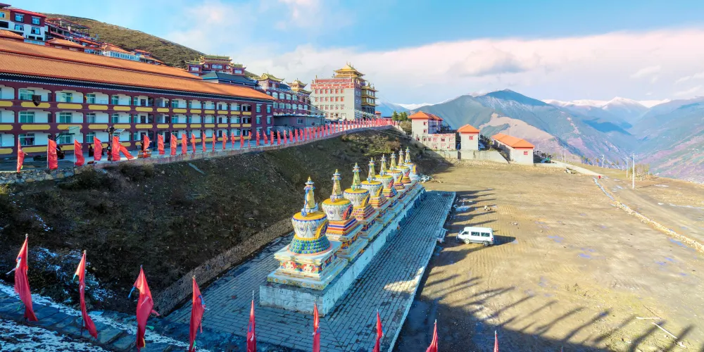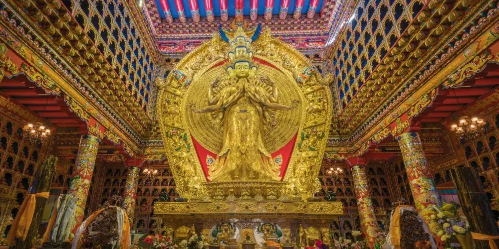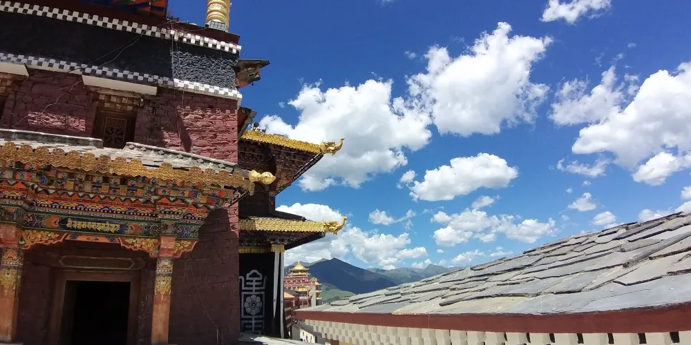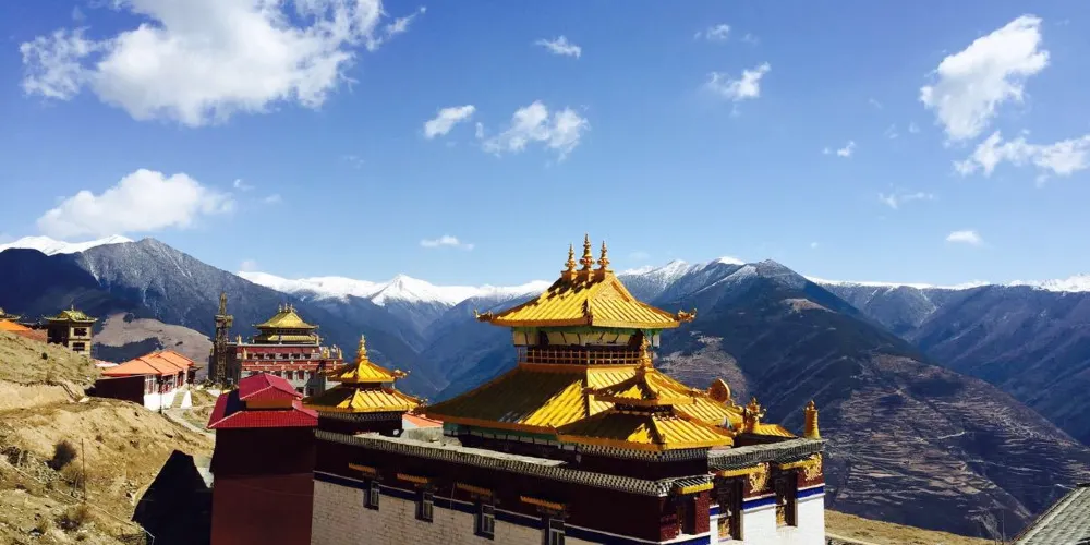 新寺院是由高達六層的寺院主樓、四棟僧侶宿舍樓、寺院賓館和遊人接待室等構成。寺院主樓一樓為大經堂、二樓為講經堂、三樓為藏經樓、四樓為多媒體電教室、五樓為金佛殿、六樓為陳列館,樓頂為金頂。寺院地勢開闊,環境優美,有雪山、高山草甸、原始森林。
