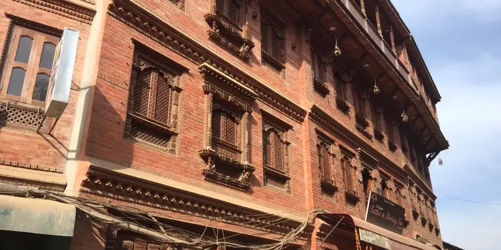 主體宮殿是一座四層磚木結構建築,牆為暗紅色。因其上開有五十五扇黑漆檀香木雕花木窗而得名。其窗欞飾以寶石、雕花則顯示出尼泊爾中古時期精湛的木雕藝術水平。