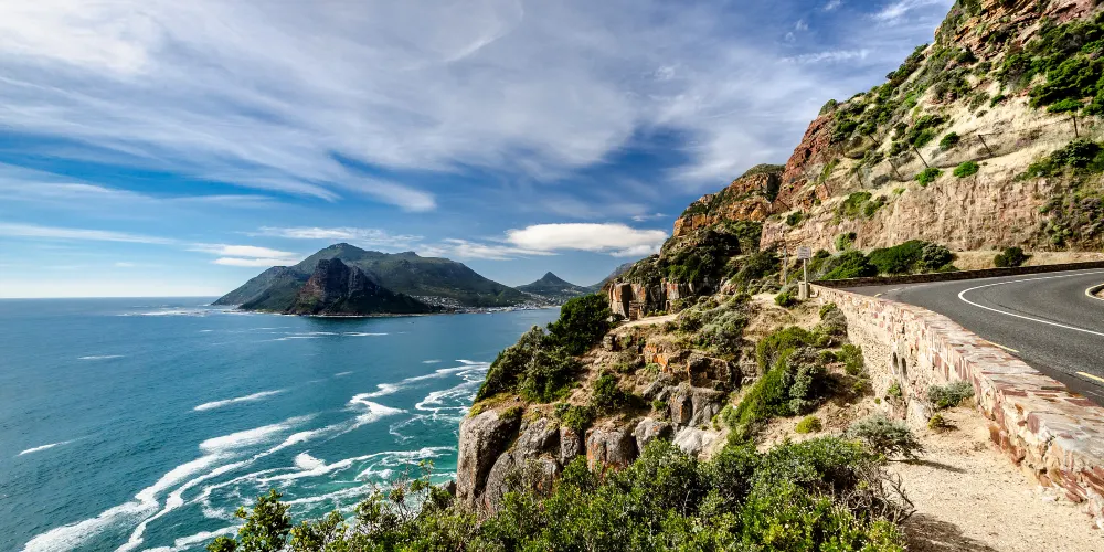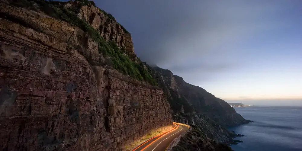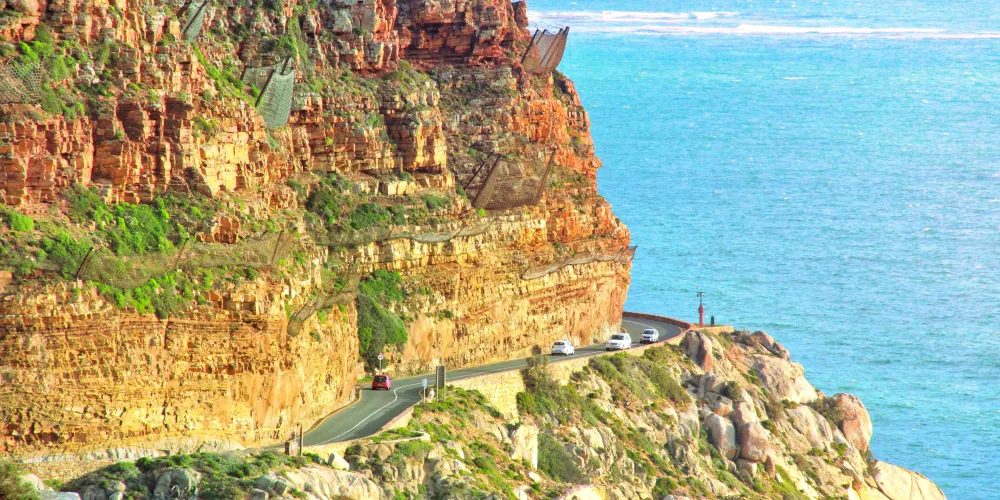 從開普敦主城區出發後,沿著靠近大西洋一側的公路,途經海角、班特裡灣、克裡夫頓灣、坎普斯灣等景點,一路往南到達知名的豪特灣,然後就來到了世界聞名的查普曼峰,這裡距離開普敦主城大約15公裡。這段絕美的懸崖位於衛星城鎮豪特灣與諾爾德霍克之間,令人心驚肉跳的修建在懸崖上的環山公路全長約7公裡。這猶如穿過半開放式的隧道,讓人不禁產生“泰山壓頂”的感覺,擔心稍不留神,頭上就有巨石垮塌下來!更何況邊上還是深淵,駛過時需要一絲不苟,容不得半點差池。