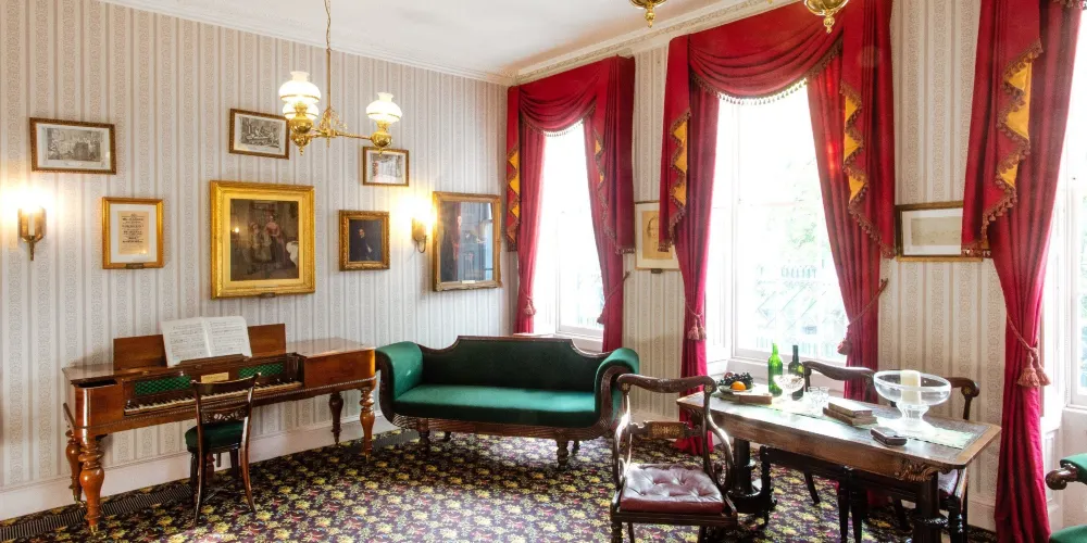 狄更斯按照當年最流行的裝飾風格精心裝修了這幢房子,傢具材質考究,皆為深色花梨木,厚重的紅絲絨窗帘遮擋著窗外的陽光。你可以參觀具有維多利亞時期風情的客廳、餐廳、臥室、書房等陳列,看到狄更斯幼年的照片、彈過的鋼琴、寫的手稿、書信及其他私人物品。在狄更斯寫作的書桌前,設想一下他當年的生活狀態、回味一番他作品中的句子吧。