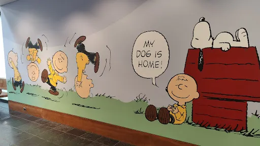 史努比(Snoopy)或許是世界上較有名的一衹漫畫中的小狗了,它的出處來自查爾斯·舒爾茨的漫畫“花生”(Peanuts),故事裏的史努比和它的憨憨主人查理·布朗有着各種奇趣古怪的經歷,不會説話的史努比更是有着很多另類的幻想創造,這2位的可愛舉止深受大眾的喜歡,於是,史努比也就變成了世界聞名的小狗了。在史努比博物館的參觀,應該是輕鬆愉快的過程,不需要太多的講解,就能很快的融入這個美好童真的世界中,博物館隨處可見不同造型的史努比雕塑,較有名的莫過於它慵懶的躺在狗屋上思考狗生的形象雕塑了,記得和這位大名狗拍照留念哦。