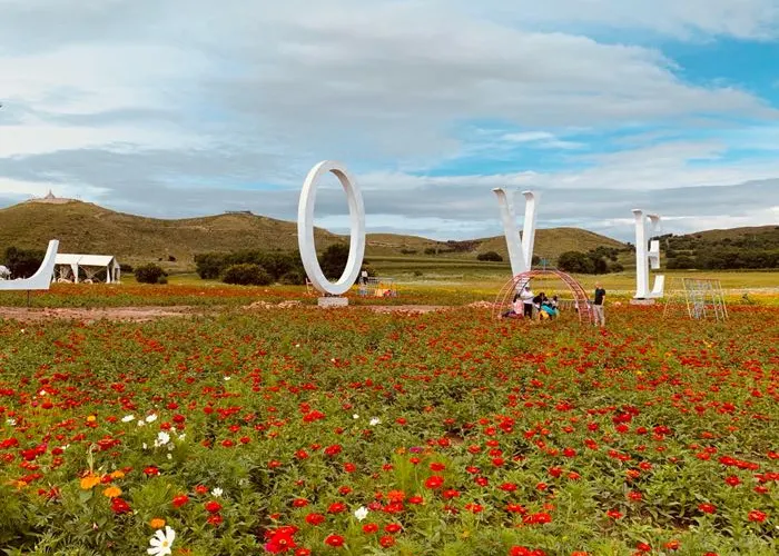 景區位於察爾森鎮內加油站正對面柏油馬路直行500米,園內目前有花海區、小童遊樂區、燒烤露營區以及木屋住宿區域,以及單車,為您在察爾森境內旅遊觀光提供便利舒服的旅遊環境。看這600畝花田由四周的柞樹林護佑着,自敖包山一瀉千米,猶如一簾幽夢。敖包山又像一位慈祥的蒙古族阿媽,帶着幸福的微笑安坐在旅遊接待處和安達廣場中間,聽着察爾森湖的漁歌,為待字國中的女兒連夜綉制的滿鮮花的嫁衣。走在花團錦簇的甬道,坐在芳香四溢的長椅,或者靜立在花田裡的風車前,你心中會心潮澎湃。這些花,既不是令人愛戴的國花、也不是千嬌百媚的名花,卻開得這樣自然、坦盪。在名花譜裏找不到它們的名字,甚至,它們都沒有自己的花語,它們是花中的老百姓,默默地長在路邊、街角、田野、山崖。