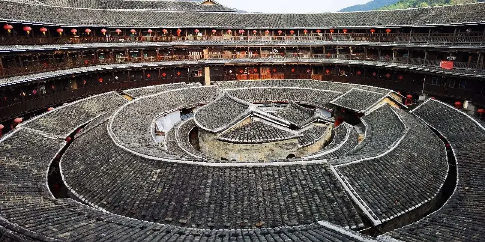 承啟樓位於永定縣高頭鄉高北村,相傳它在明崇禎年間奠基,清康熙年間竣工,曆時半個世紀。該樓出現在1986年發行的“中國民居”郵票中,代表著福建民居。它被形容為“高四層,樓四圈,上上下下四百間;圓中圓,圈套圈,曆經滄桑三百年”。