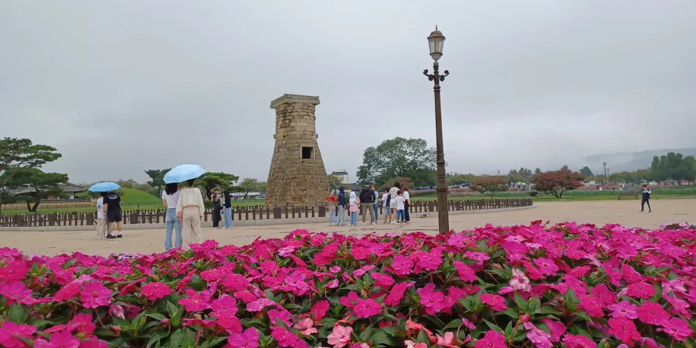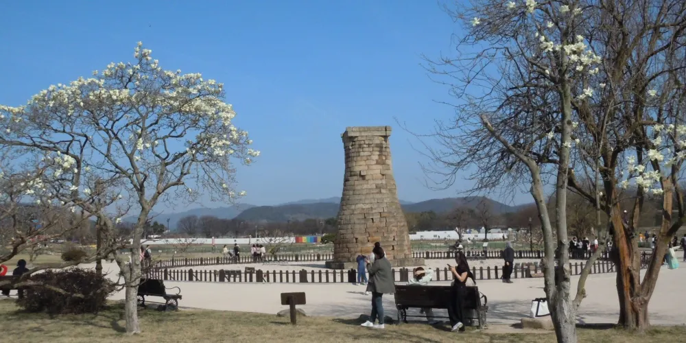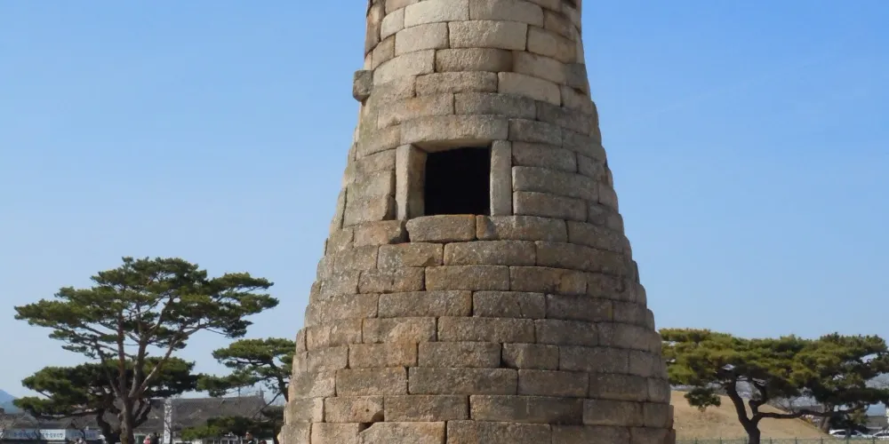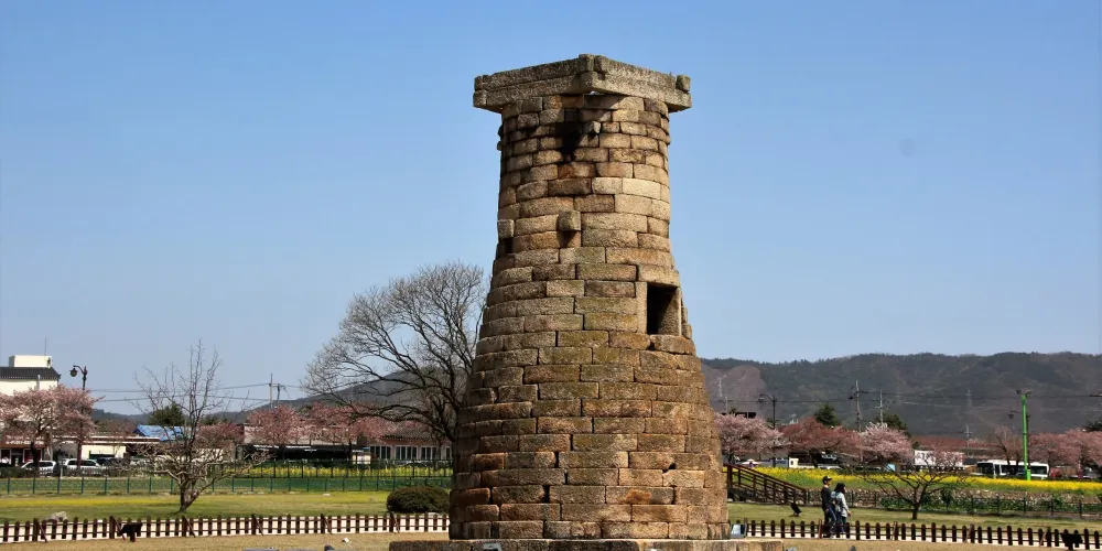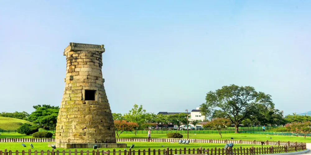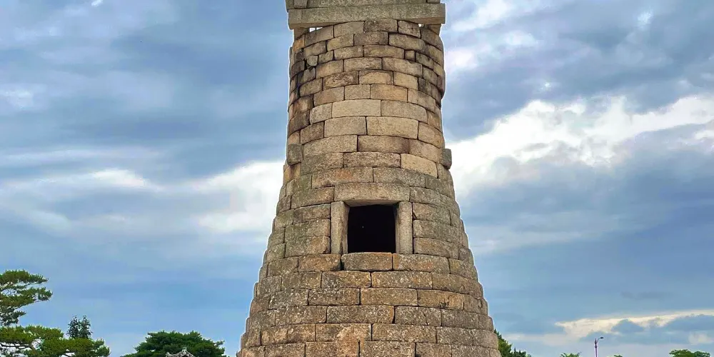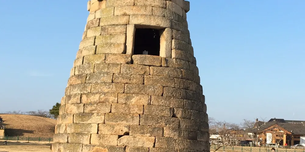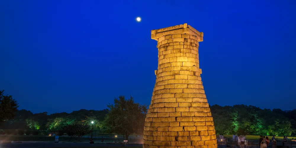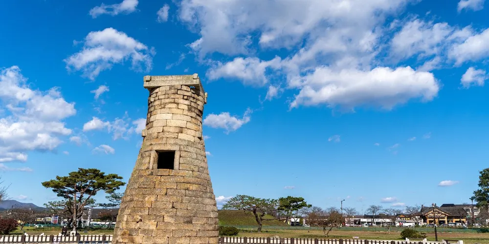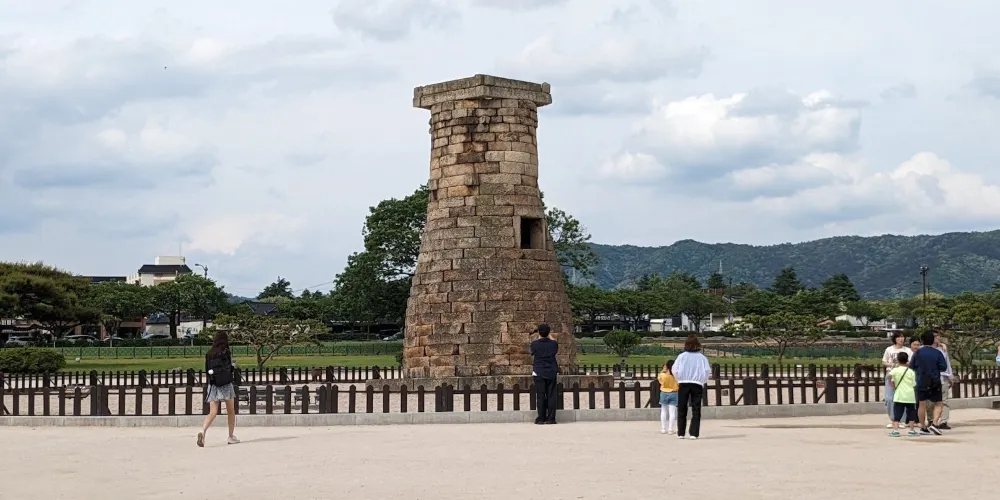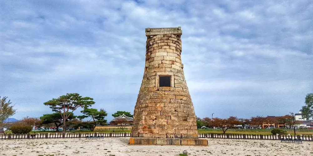 瞻星台顧名思義就是古時候用來看星星的地方,建於新羅27代王善德女王時期,新羅時期主要作為天文觀測台使用。整個瞻星台是由花崗岩所建,高9.17m,上端直徑3.1m,下部直徑5.17m,地基石座的單邊邊長為5.35m。雙層地基石座與祭壇呈方形,大小分別是長台石的8倍和15倍。石座上則為27層的圓筒型塔身。整個瞻星台下寬上窄,豎直而立。瞻星台每層高度約為30cm,頂端為雙層井字形石壇,據推測這裡曾是某種觀測儀的放置之處。最上方是井字形狀,而連接的部分卻是酒桶狀的圓體,因為常被誤稱為“摘星台”。