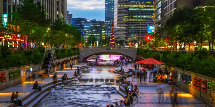 清溪川是一條貫穿首爾南北的人工運河,是首爾市民和遊客可以休憩的場所,與光化門、市廳、鐘路、東大門等景點形成了頗有人氣的觀光區。夜晚的清溪川瀰漫著浪漫的氣氛,是夏天傍晚乘涼的好去處,也是戀人們喜歡約會的地方。