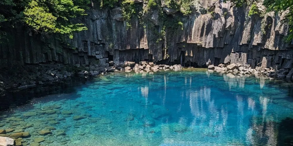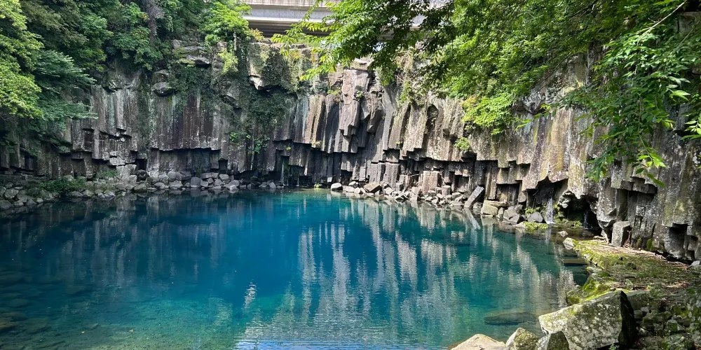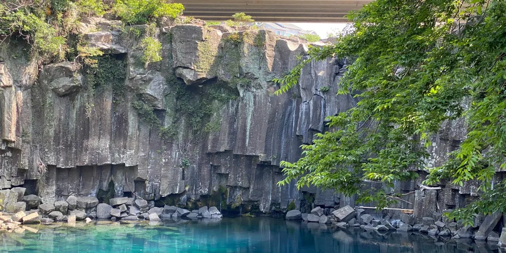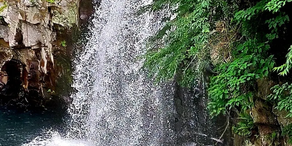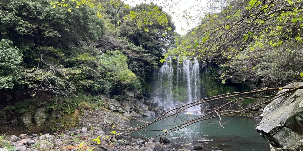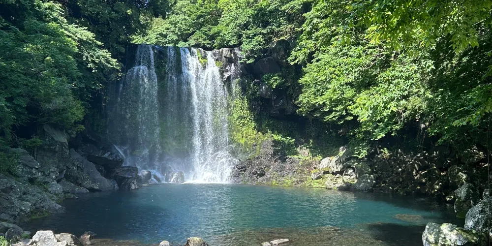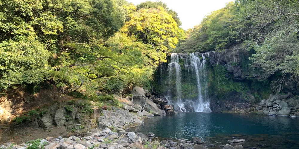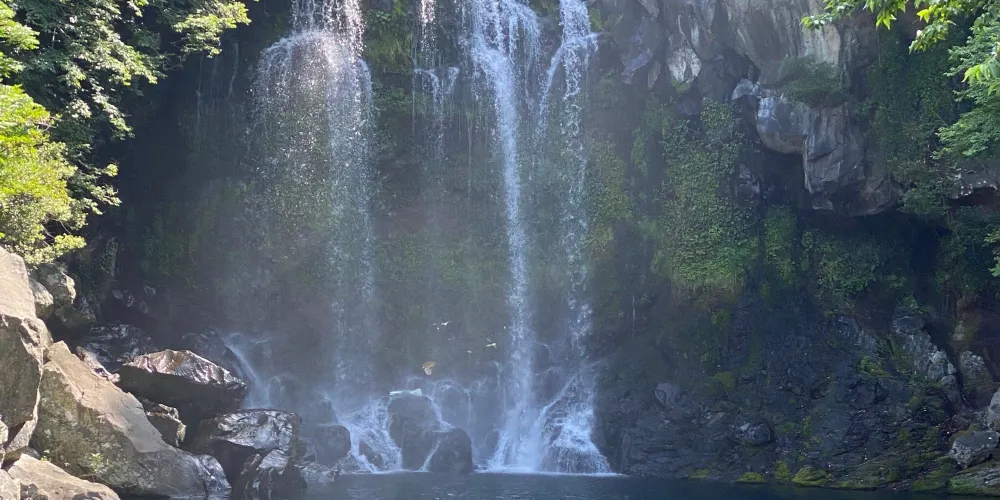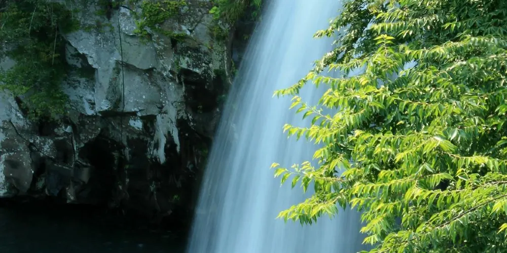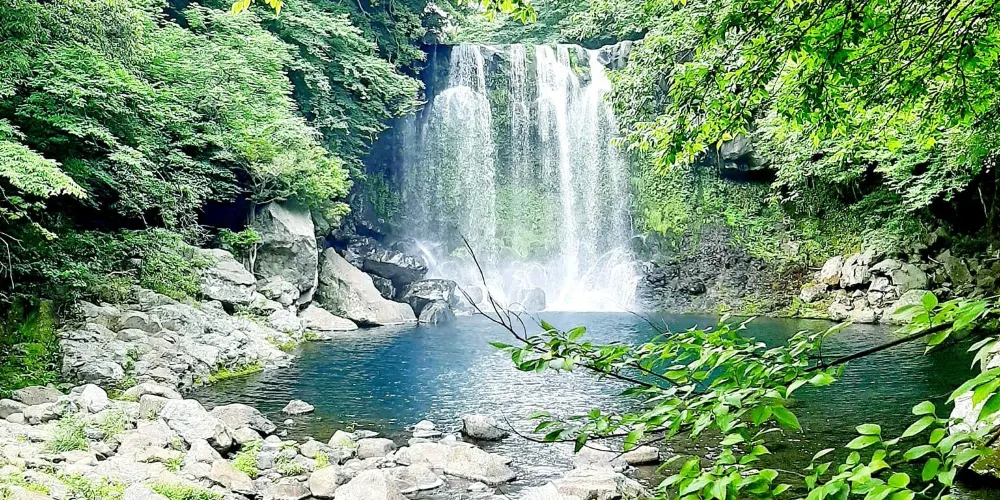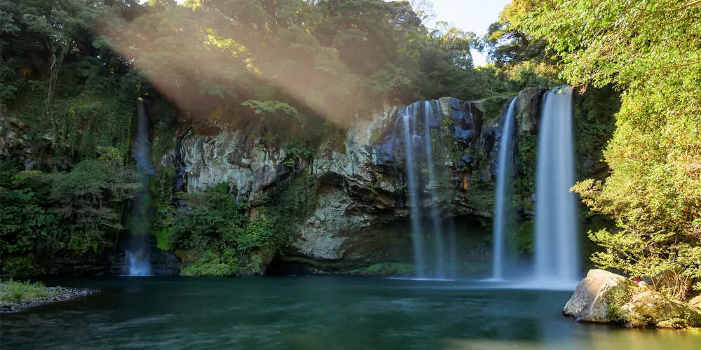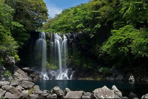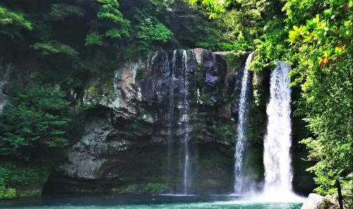 天帝淵瀑布是因為傳說中玉皇大帝身邊的七仙女偷下凡間沐浴嬉戲而得名。天帝淵,顧名思義,是“天帝之淵池”之意。瀑布分為三段,周圍的溫帶森林有鬆葉蘭等珍貴的植物。瀑布所在的東方的岩石洞頂部有冰涼的水流下,形成一個瀑布,從瀑布飛流直下的水又形成第二、第三瀑布,後來都流入大海。