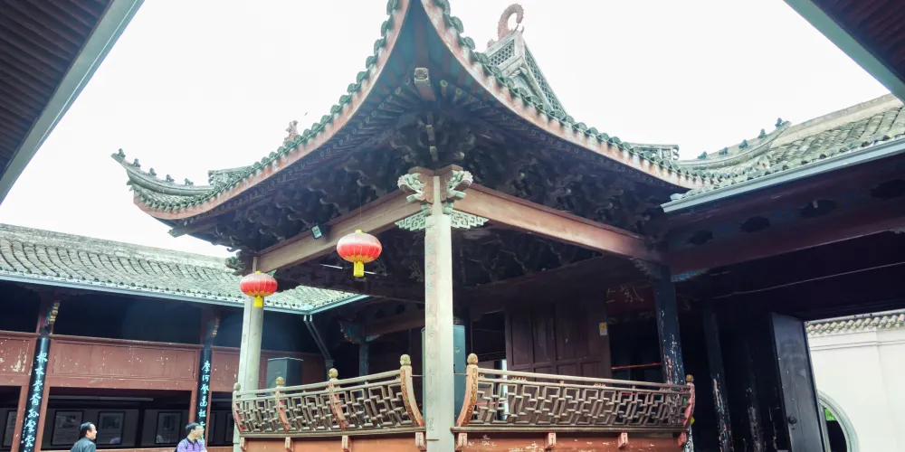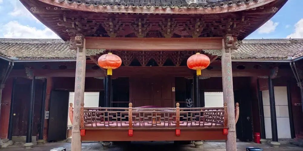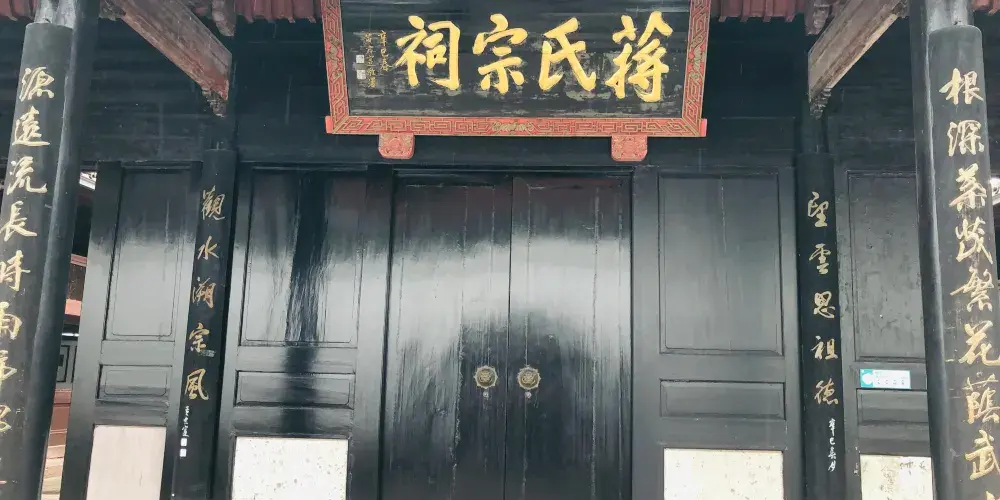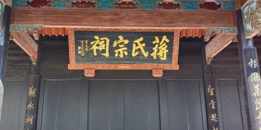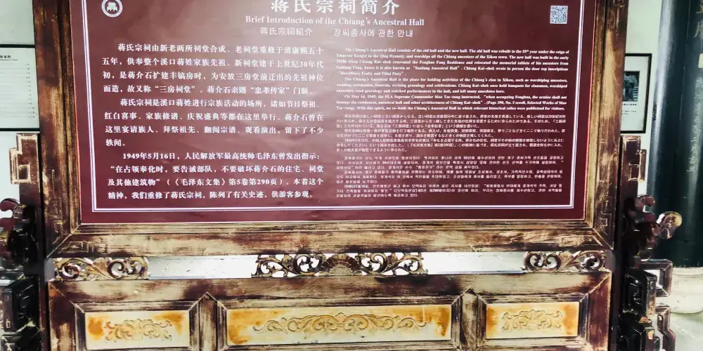豐鎬房即蔣氏故居,是溪口鎮上重要的人文景觀。從前,按照當地的習慣,每個家庭都有房名,蔣氏在宗譜中屬“周”字輩,由此推及西周兩代皇帝建都的豐邑、鎬京作為自家的房號,希望自己的家族也能象西周一樣興旺發達,豐鎬房的名字就這樣定了下來。豐鎬房又名素居,是因蔣家世代信佛,吃素唸經,故而得名。豐鎬房佔地4800平方米,建築面積1850平方米。建築格局為前廳後堂、兩廂四廊,是傳統的世家府第格局。前廳及左右還有三個花園,有月洞門相通。中間小天井,兩邊有金銀桂花各一株,是宋美齡親手所種。東廂房留給宋美齡居住,但一直都空着。西廂房為毛福梅的住所。西廂房西側有幢獨立小樓,原系祖傳的三間房屋,這裡是蔣母王采玉舊居。為尊重祖宗,保留風水,豐鎬房擴建時所有新宅屋基,高度不能超出這幢祖居的屋基。豐鎬房裡還有三大看點,即雕刻、彩畫和堆塑。進入前廳,抬頭可見屋頂正中的堆塑,兩邊是“雙龍戲珠”。祭祖敬天的報本堂,是豐鎬房整個建築的核心。走廊兩端壁上有兩幅彩畫,東首是“八仙過海”,西首是“姜太公釣魚”。柱頭兩側的“牛腿”上是木雕,是《三國演義》中的故事,從東到西分別是“劉備招親”、“夜戰馬超”、“關羽戰長沙”和“回荊州”。東西廂房四個柱頭上的木雕也取材於《三國演義》,即“送皇嫂”、“古城會”、“上馬獻金”、“斬顏良”。東廂房走廊上的木雕,內容是《精忠岳傳》,有“湯陰大水”、“拜師周侗”、“操場比武”、“岳母刺字”。東廂房走廊上的雕刻是上八洞神仙的羣像,有鐵枴李、呂洞賓、韓湘子、何仙姑。還有“聞太師回朝”、“陳琳抱盒”、“岳飛收花槍”等彩畫。
