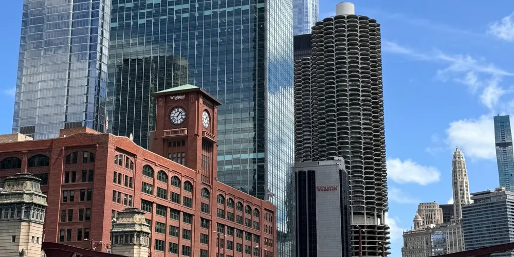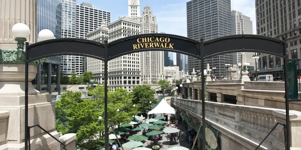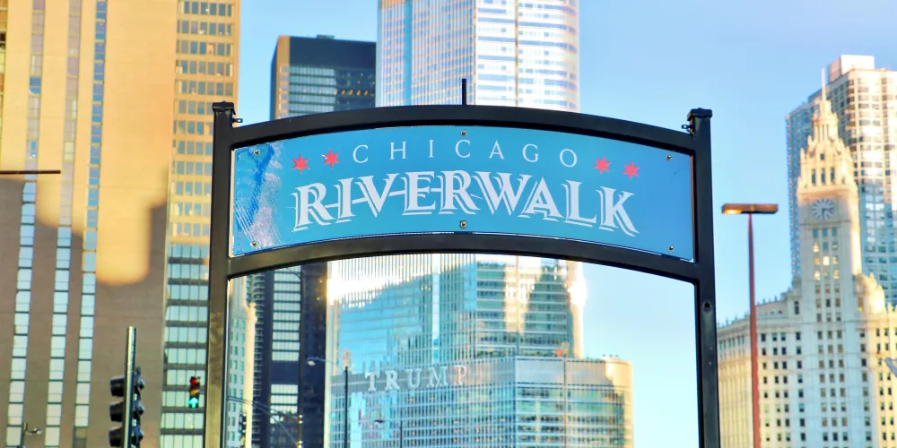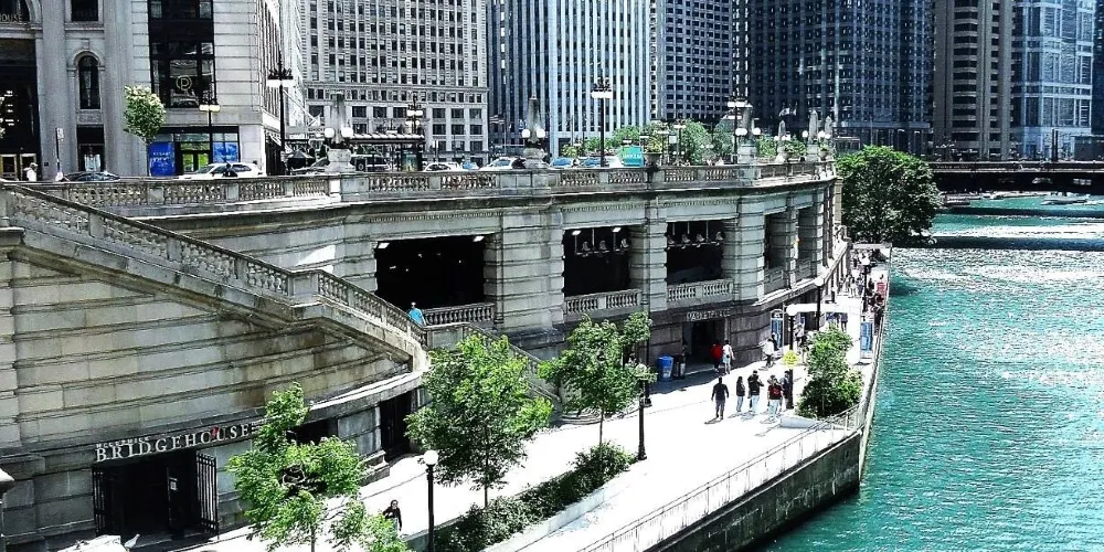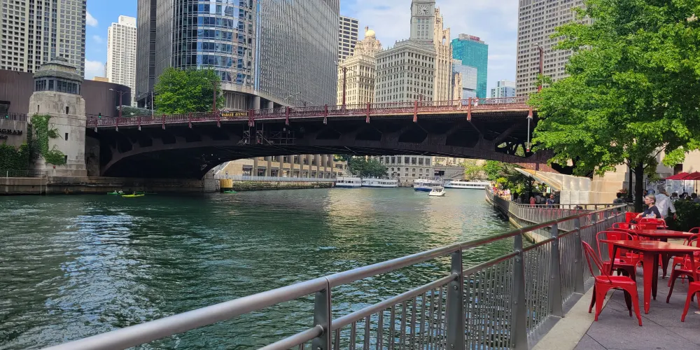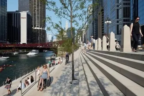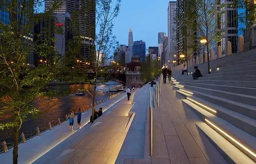 芝加哥濱河步道(Chicago Riverwalk)全長1.5公里,從密西根湖向西延伸至湖街,串聯碼頭廣場、河劇院等六大主題段落,以現代設計與歷史建築交融為一體為特色。步道全程鋪設無障礙通道,沿途可見波浪形休憩座椅、垂直花園及公共藝術裝置。