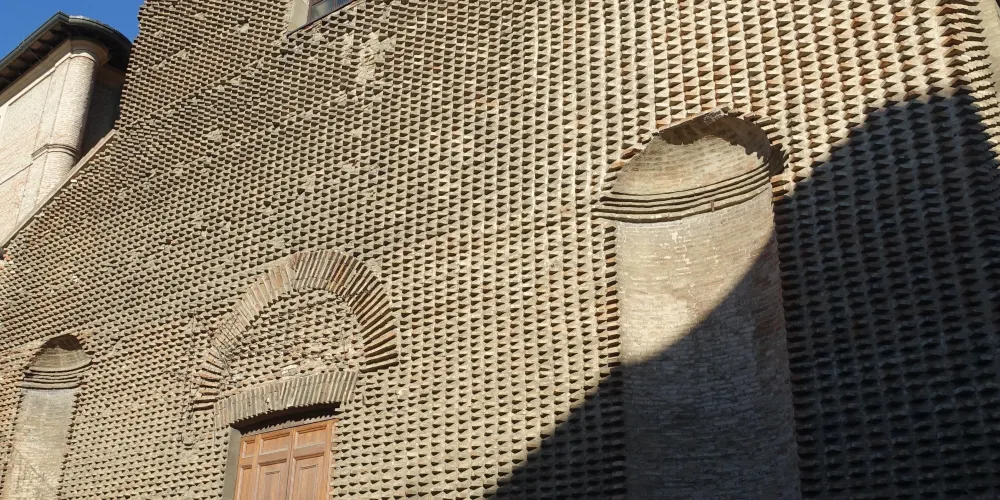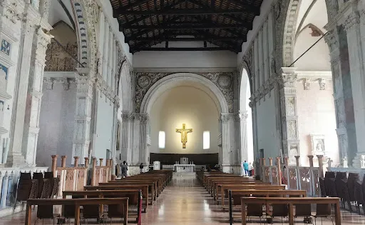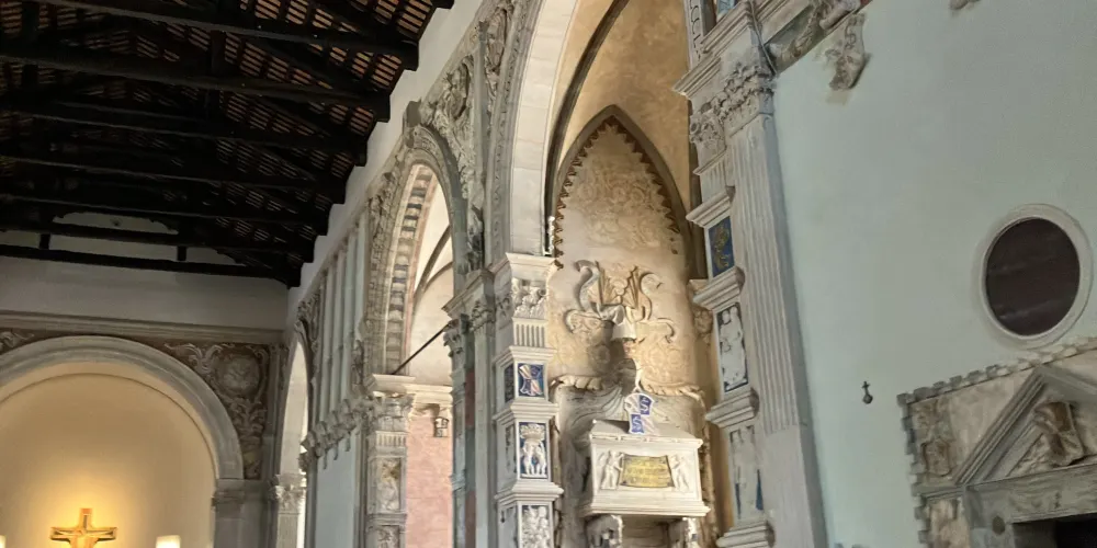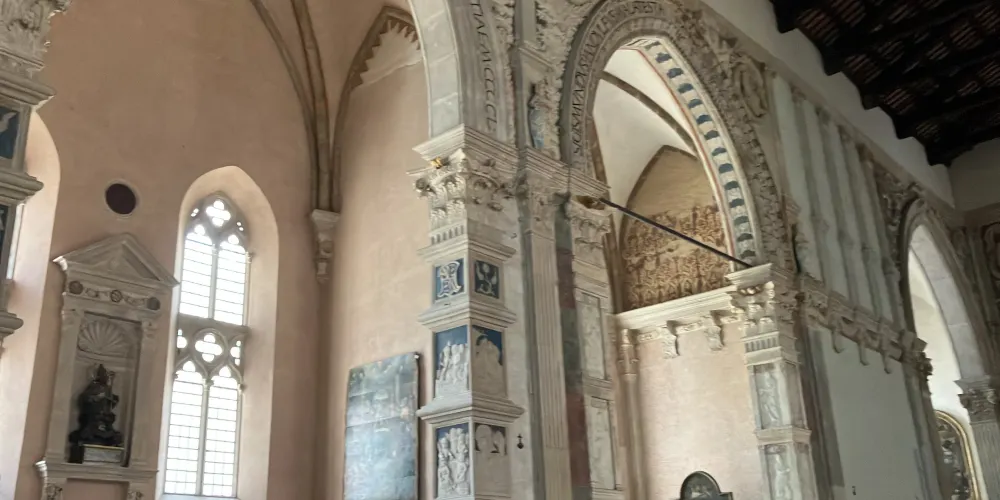教堂正面大部分並未完成,是當時世界上最偉大的建築家之一佛羅倫薩的阿爾貝蒂修建的。大理石欄杆把邊上的小教堂與寬敞的教堂中殿隔開,欄杆頂上雕有聖潔可愛的小天使,而離聖壇最近的小教堂在南面,裡面有皮耶羅•德拉•弗朗切斯卡創作的壁畫。
