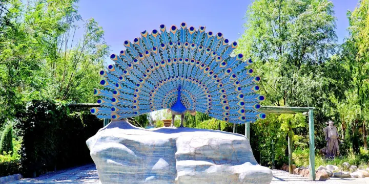 中華孔雀苑景區位於嘉峪關市區西北側,嘉峪關關城與懸臂長城之間,距離嘉峪關市區車程約5公里,是一處以藍孔雀文化為主的景區。景區內養殖了多種品種的藍孔雀約有3萬衹,並且是一個藍孔雀品種的繁育場,這裏繁育出的藍孔雀大多品種優良,十分漂亮。如今的中華孔雀苑既是一個觀光景區,也是一處可以用餐休閑的園區。遊客來到景區,主要是觀光和用餐。園內的各種孔雀主題的雕塑和孔雀園都可以觀賞,可以見到很多孔雀一起開屏的美麗景象。而園內的餐廳也提供特色的甘肅菜餚和景區內獨有的孔雀蛋等食品,感興趣的可以前去用餐。