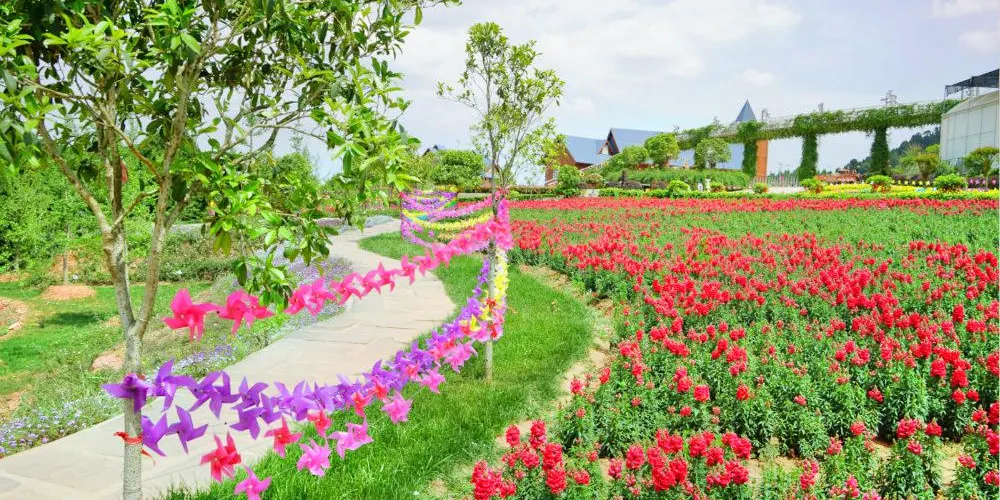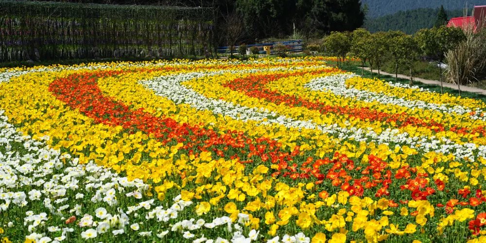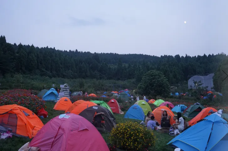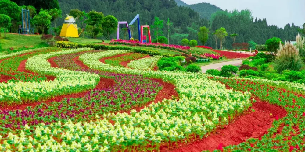 德陽旌陽區新中鎮茶店村的花田錦地·溪月谷目前完成了項目一期1200畝的建設,景區內種植有月季、桃花、牡丹、紫薇、紅楓、櫻花、玉蘭等各種花卉達100萬株,計劃打造成集森林康養、主題花卉觀賞、鄉村生態旅遊、會議培訓基地、特色餐飲、房車營地、帳篷露營、户外拓展基地等各種功能齊全的休閑度假勝地。