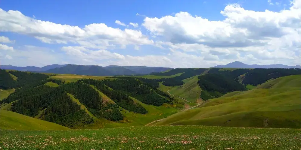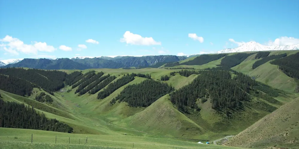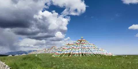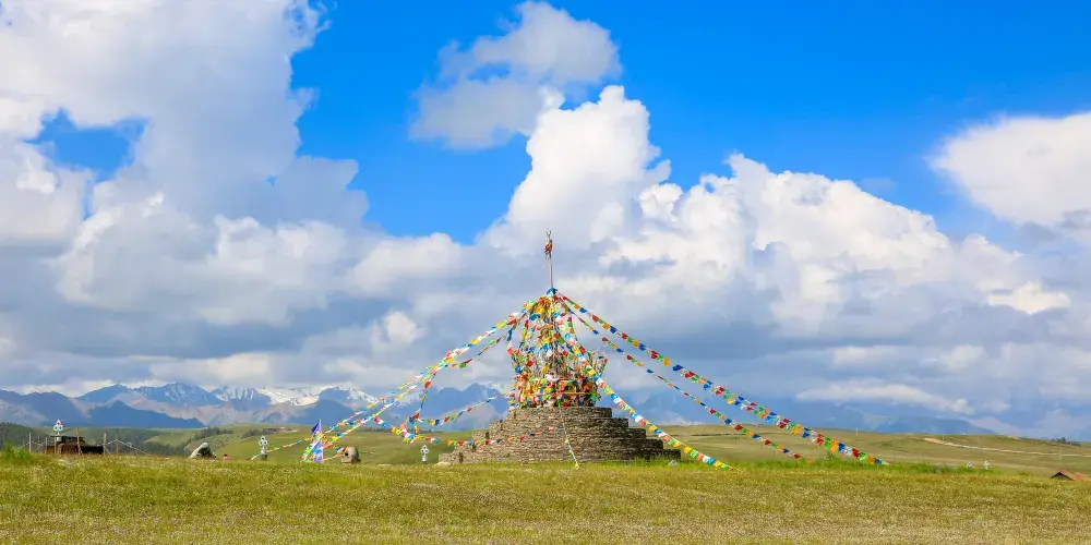 “賽罕塔拉”,意為美麗的草原。祁連雪峯下,羣山峻嶺旁,碧草如茵、繁花似錦。景區內已建成集娛樂、觀光、餐飲為一體的旅遊接待點兩處。觀景台前有久負盛名的九排松景點。人們為祈求得到山神庇護,便有了祭鄂博敬山神的活動。祭鄂博需邀請高僧誦經、煨桑、吹白海螺,拋撒“風馬”,敬獻木製寶劍、長矛,期望山神以武力護佑蒼生,祈求草原風調雨順、牛羊興旺、百姓幸福。海拔3700米,可遠眺“藍少爾崗”神山等方圓百里的山川。據説此山由騰格里山神用僧衣降服妖魔後變化而來。遠處松林蒼翠,雲霧繚繞;腳下花草起伏,如天地間舞動的彩色錦緞,人稱“百花灘”。
