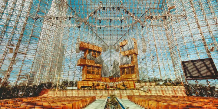 洛杉磯水晶大教堂由二十世紀建築大師菲利普·約翰遜設計,是世界知名的基督教堂之一,被讚譽為超越巴黎圣母院的建築奇蹟。教堂是由上萬塊柔和的銀色玻璃窗組成,打造了一個巨大明亮的空間,在陽光的照耀下,閃閃發光。