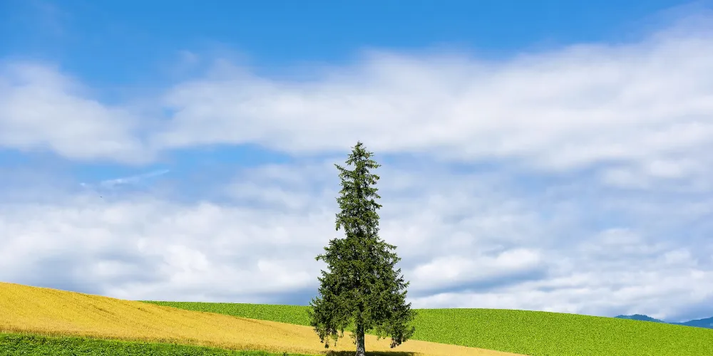 位於日本北海道上川郡美瑛町的Lone Christmas Tree,是一處獨特的自然景觀,吸引許多遊客前來觀賞。這棵孤獨的樹矗立在廣闊的田野中,四周環繞著連綿的丘陵,形成了一幅寧靜而美麗的畫面。無論是春夏的綠意盎然,或是秋冬的色彩斑斕,Lone Christmas Tree都展現出不同的自然魅力。其簡約的造型與自然背景的對比,使其成為攝影愛好者追逐光影的經典拍攝地。許多人專程守候黎明薄霧或夕陽餘暉,捕捉樹影與天光交織的瞬間。 Lone Christmas Tree的魅力不僅在於視覺美感,更因其像徵意義而引人深思——孤樹與曠野的對話,詮釋著自然界的堅韌與詩意。