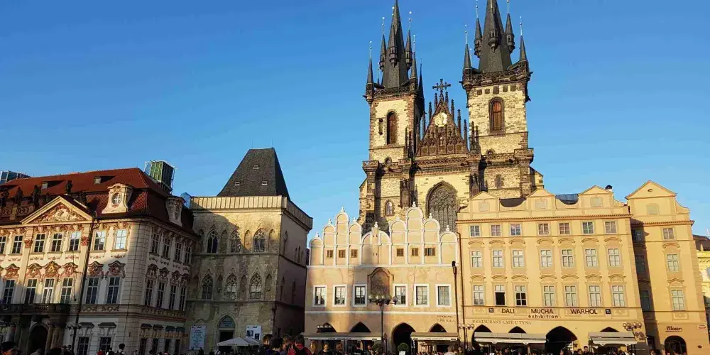 泰恩教堂是布拉格老城區的代表性建築,一對鐘樓塔高聳如雲,高達80米,構成教堂正面,每個塔頂有4個尖頂,更是構成了「塔中有塔」的奇妙景象。高塔的頂端裝飾著純金細長圓棒,遠遠看去如火焰一般。