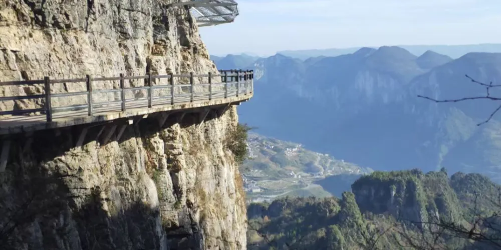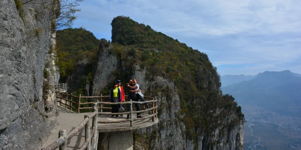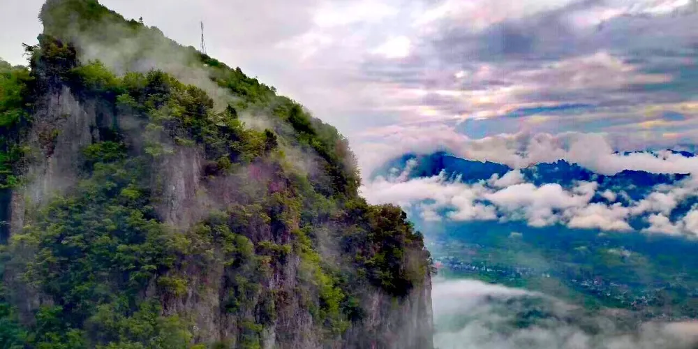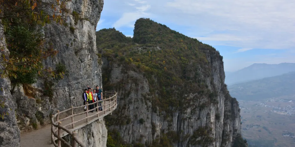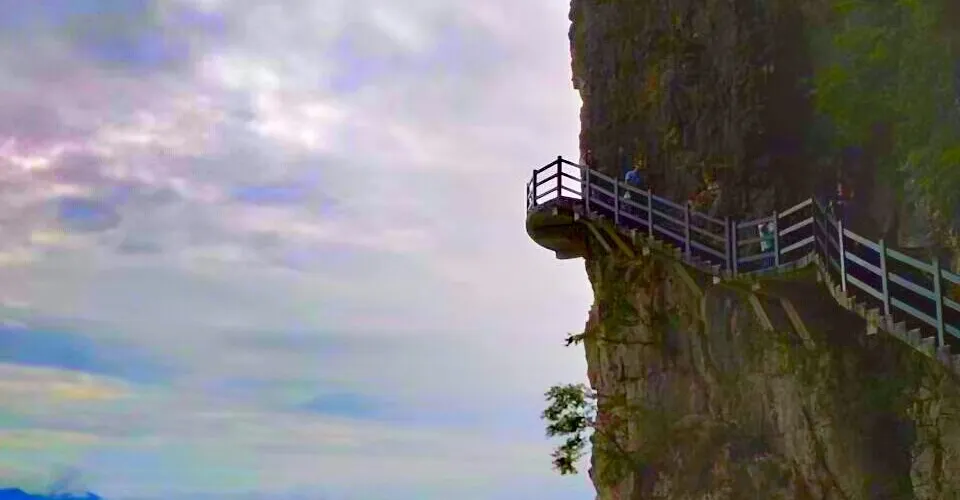 絕壁棧道,又稱步雲天棧、絕壁長廊:始建於 2006年8月,歷時1年又8個月建成。棧道位於山體東側的直立懸崖絶壁山腰,海拔約1700餘米,全長488米、高差達300米、石階118個,與山巖絕壁融於一體。因該棧道建於絕壁之上,所以也有人稱之為絕壁長廊,或“絕壁棧道”該工程是巴蜀古棧道製造技術與現代鋼筋砼建材、先進施工工藝的結合,科學安全,大氣壯觀。