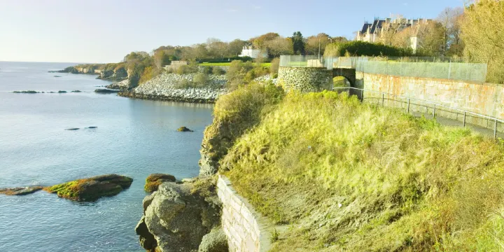 沿著紐波特東海岸的Cliff Walk是一條長3.5英裡的散步小徑,沿路有各種花草樹木,小鳥,碎石,曆史建築。1975年Cliff Walk被評為美國國家遊徑(National Recreation Trail)。這是新英格蘭地區一條也是全美第65條。整個小徑走完全程約需2.5小時至3小時。其中在Narragansett Ave上有兩家廁所方便徒步的遊客使用。
