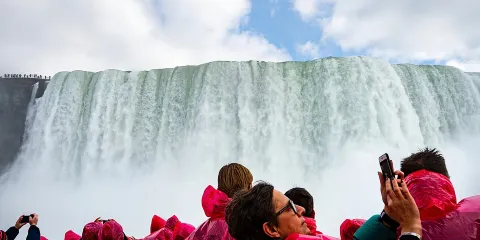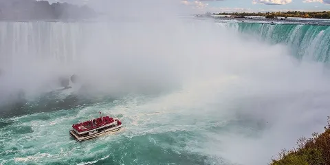 “號角者”遊船(Hornblower)是一項令人激動,全新體驗尼加拉瀑布的玩樂項目。穿上薄薄的紅色雨衣,乘坐可承載700位乘客雙層遊輪,經過美國瀑布,新娘面紗瀑布,駛入馬蹄形瀑布的心臟地帶,在遊輪的360度無阻礙無水觀賞區與瀑布親密接觸,感受瀑布充沛的水量、振聾發聵的轟鳴聲,這種驚險與刺激會令你畢生難忘。全程約30分鐘,白天每隔15分鐘一班,另外,遊輪提供付費的中文全新語音導覽機。