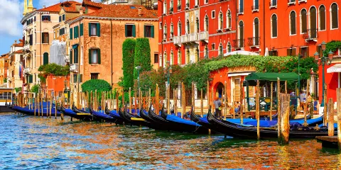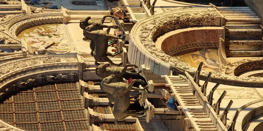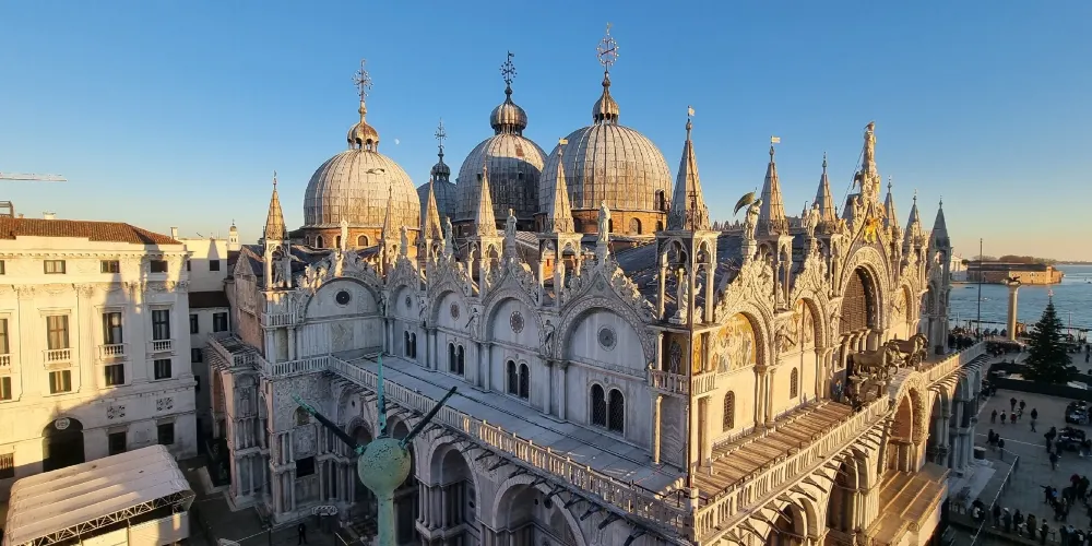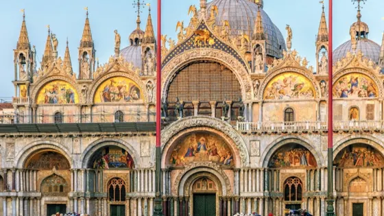 聖馬可大教堂位於聖馬可廣場,毗鄰總督宮,成立於828年,11世紀因火災而重建。最初是用來安放聖馬可遺骸的,後來被用來收集東徵時各國的戰利品。回寶。它曾經是中世紀歐洲最大的教堂,也是豐富藝術的寶庫。建築風格 聖馬可大教堂以拜占庭風格為主,融合了從羅馬式到文藝復興風格的各種建築和裝飾風格。正面有五個菱形拱門形狀的羅馬式大門,頂部有東方和羅馬式的大門。德國尖塔和各種大理石雕像、浮雕和花形圖案、巨大的圓頂和絢麗的馬賽克是其突出的特色。教堂由五個巨大的圓頂主廳和兩個與世隔絕的前廳組成,形成一個巨大的希臘十字架。五個圓頂是仿照土耳其伊斯坦堡的聖索菲亞大教堂建造的。教堂前矗立的三根旗桿寓意深刻,代表著威尼斯在鼎盛時期所擁有的塞浦路斯、克里特島和摩里亞三個島嶼,是這座城市輝煌歷史的見證。教堂中央頂部有一尊手持馬可福音的聖馬可雕像,下方是像徵聖馬可的飛獅。