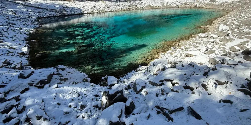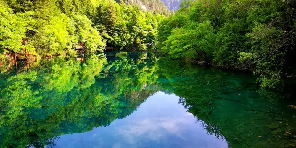 中季節海位於則查窪溝中段,四周森林環伺,林間松蔓輕舞,苔蘚漫地,深藍的湖面好像一塊凝固的寶石。所謂季節海,就是隨季節出現或消失的海子。
