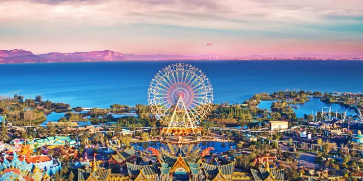 七彩雲南歡樂世界主題樂園位於昆明晉寧區環湖南路邊,以“古滇文化”、“民族文化”、“地域文化”為特色,以獨特新穎的方式規划出七大主題分區:滇軍營地、幻滇奇域、童夢世界、永珍部落、洪荒秘境、霜月寒洲、四季花海,並為孩子們打造了娛樂中心——FEC樂園。