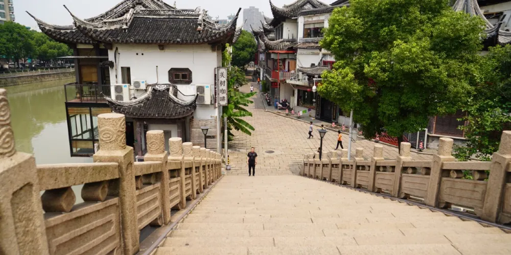 篦箕巷前的古運河上船隻往來,西北端有懷德橋橫跨河上,橋頭旁是皇華亭,亭中立著現代書法家寫的毗陵驛碑。毗陵驛是一個驛站,《紅樓夢》中,賈政最後一次見到賈寶玉便是在毗陵驛。皇華亭對面的牌坊寫有“大碼頭”三字,乾隆南巡時,曾從大碼頭登岸進城。沿著篦箕巷往東南行,經過篦梁燈火牌坊,走到底能看到始建於明代、重修於清代的文亨橋。