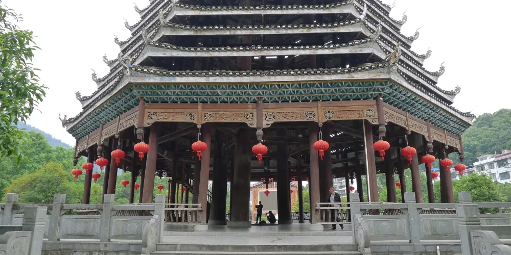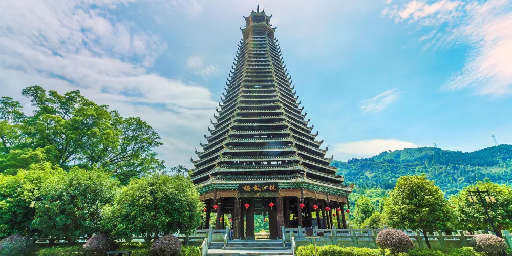從江鼓樓位於黔東南苗族侗族自治州從江縣,是目前較為宏偉的鼓樓。該鼓樓採用當地的杉木建造,是多柱結構形式。鼓樓內的大廳有火塘,火塘四周設有寬大的長凳或靠背長椅。寨中有事商議或節日踩歌堂的時候,便捶響大皮鼓,寨中鄉親都會聚在鼓樓大廳中聽長老發號施令。而平日,鼓樓大廳就是休閒的公共場所。