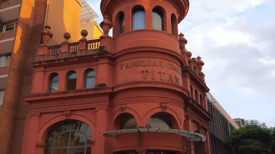 • 整棟大樓的外牆面貼著彩色的馬賽克、屋頂的樣子酷似龍鱗,處處充滿了魔幻色彩