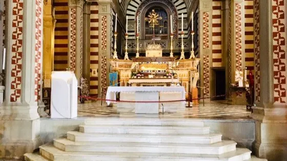 • 主教座堂有著十九世紀哥德復興風格的立面,其外部使用色調深淺不同的白、綠和粉紅多色的大理石塊所鋪砌而成,色彩斑斕而和諧
