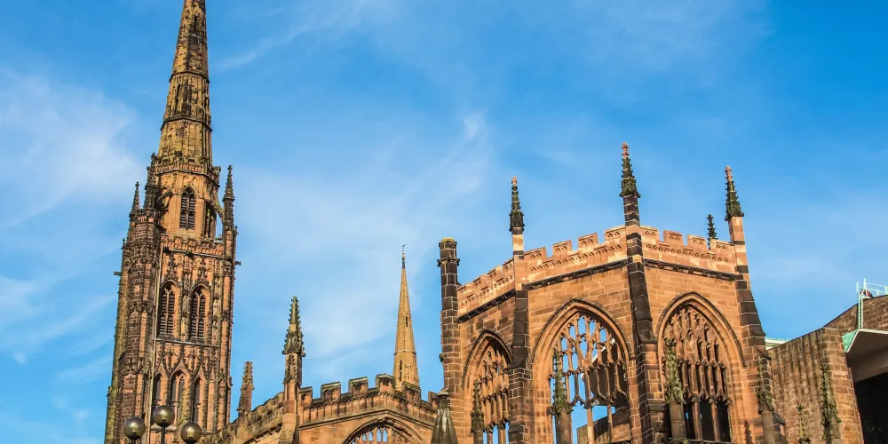 考文垂座堂位於考文垂市中心,也叫聖米迦勒大教堂(St Michael's Cathedral),建於約1300年。在閃電戰期間它毀於納粹的空襲,僅剩下外牆和哥德式頂尖,成了考文垂黑暗時光的永久紀念。新的教堂緊鄰著老教堂的牆壁而建,這座現代主義風格的建築裡,不僅擺著一台未來風格的風琴,還有彩色的玻璃窗和雅各布·愛潑斯坦(Jacob Epstein)的雕塑作品,表現了聖米迦勒大戰惡魔的情景。