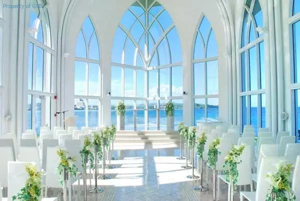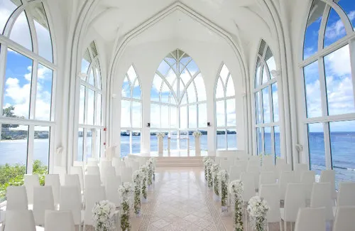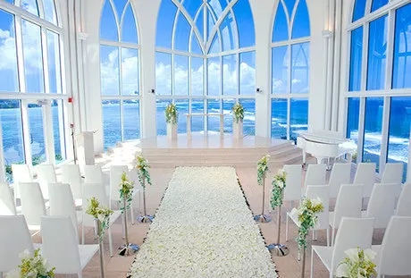 建於2004年的水晶教堂坐落在杜夢灣北部,位於日航酒店內,向南可以眺望整個杜夢灣全景,向北可以仰望情人崖,教堂乾淨、通透,深受新人們的喜愛。水晶教堂的外觀採用哥特式建築風格,陽光通過透明的藍色彩繪玻璃照進以白色為基調的教堂,藍白互相輝映,玻璃相互映襯故得名水晶教堂。水晶教堂內的設備大多也是白色的,白色的鋼琴和木質賓客椅,透明的玻璃儀式台,透過玻璃是美麗的大海。