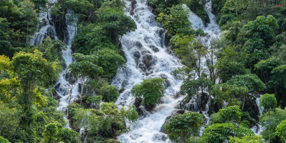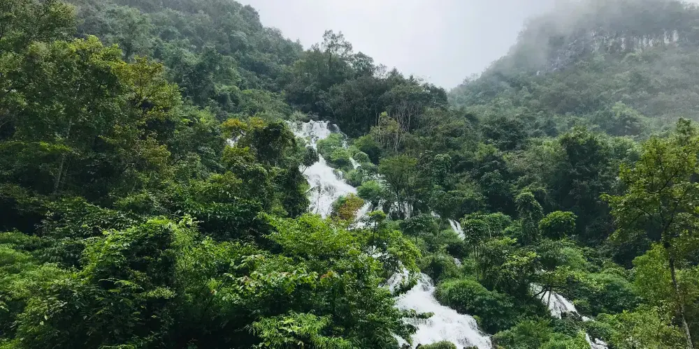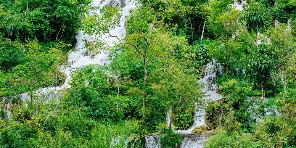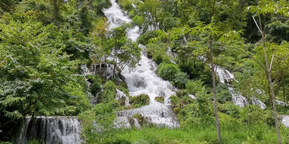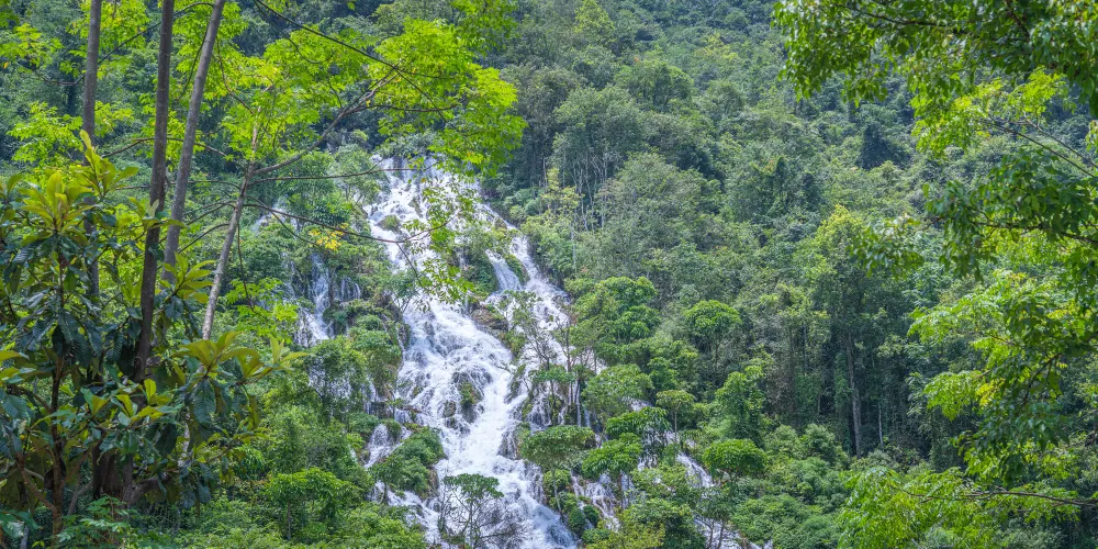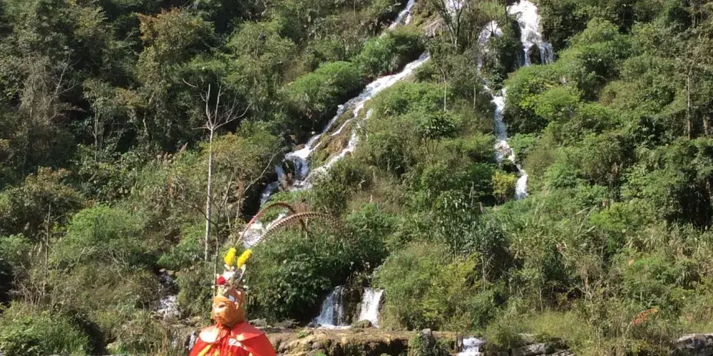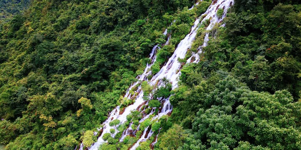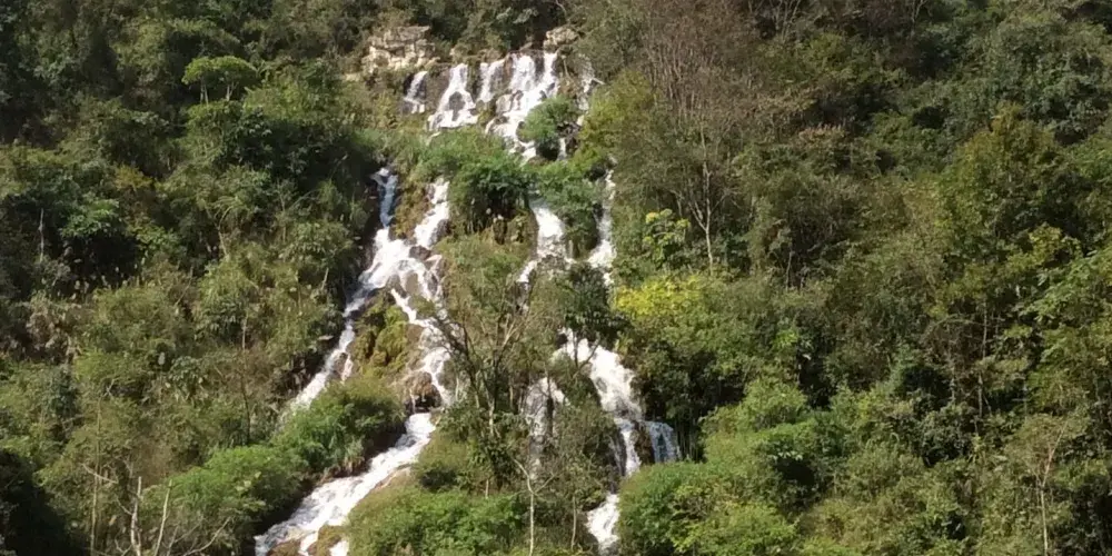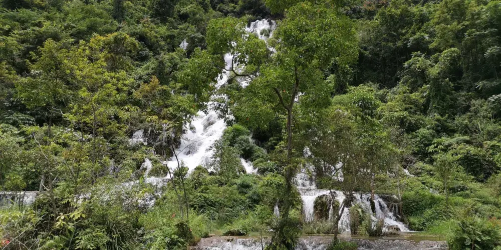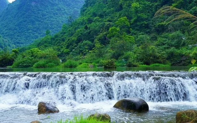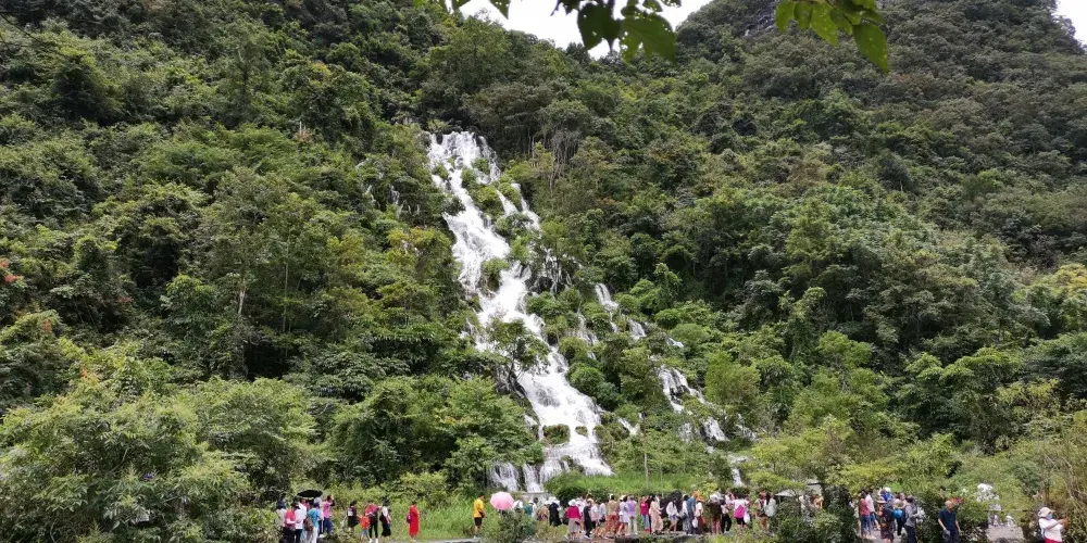 翠谷瀑布這裏羣峯緊鎖,羣山蒼翠欲滴,故名“翠谷”。翠谷瀑布懸於羣山之腰,是小七孔景區落差較大的瀑布,瀑高60多米,遠看似條玉帶懸于山間,近探水順山勢傾瀉而下,浪花飛濺,水霧濛濛,猶如羣龍下山,清新悦目。