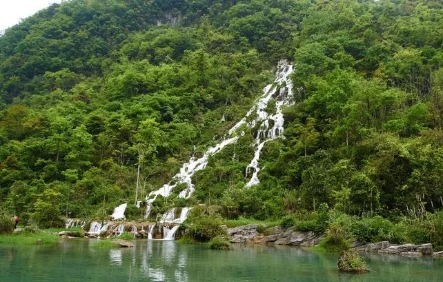 小七孔景區-卧龍潭源源不絕的綠水從壩上滾下,形成龐大的特色瀑布,瀑佈如絲,月牙的形狀猶如一把仙人梳。站在壩側岸頭,小七孔景區-卧龍潭的美景一覽無餘,薄霧濛濛,尤入仙境,讓人震撼不已。