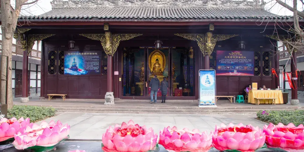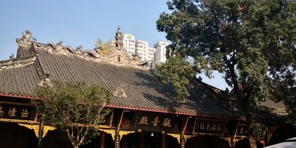 寺院內三大士殿、大雄寶殿、説法堂、藏經樓5座大殿遞次連接,與東西兩側的鐘樓、齋堂、廊房渾然一體,再配以其他建築,形成一個封閉的四合院。院內還開設有茶館和具有特色的素餐館“香齋堂”,使得這裏成為本地居民喜愛的休閑之地。