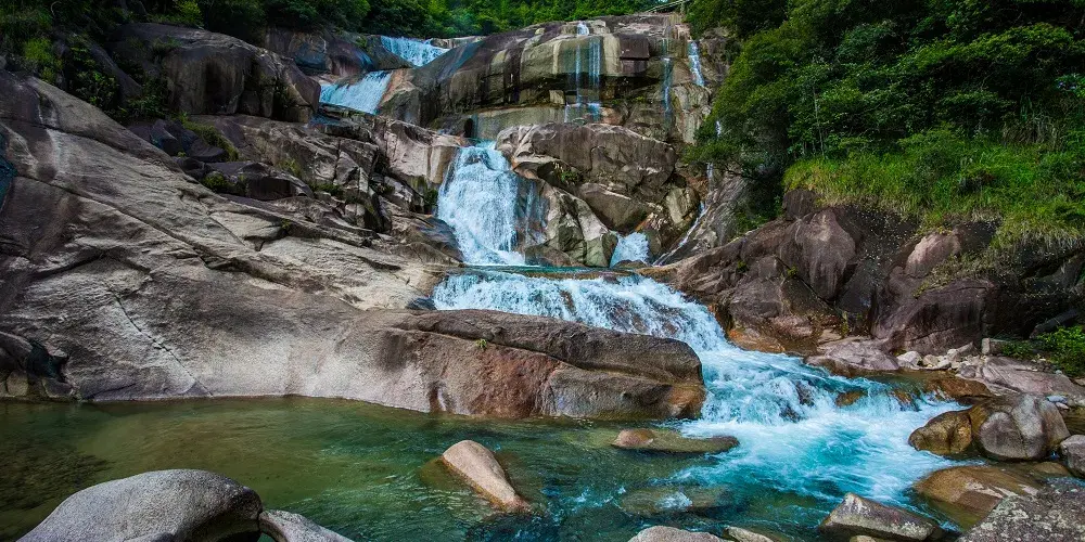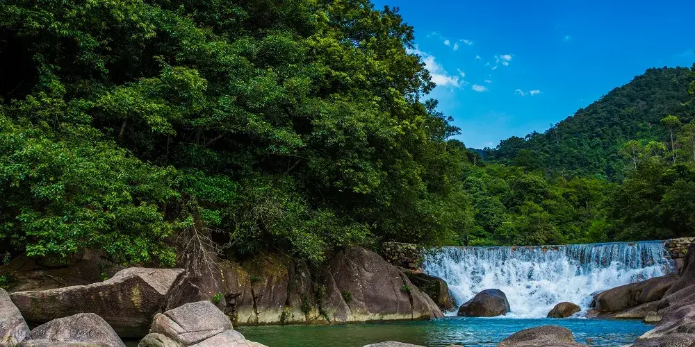 則評價觀音潭因譚邊一塊白石似觀音端坐而得名,是賞石觀瀑的好地方。