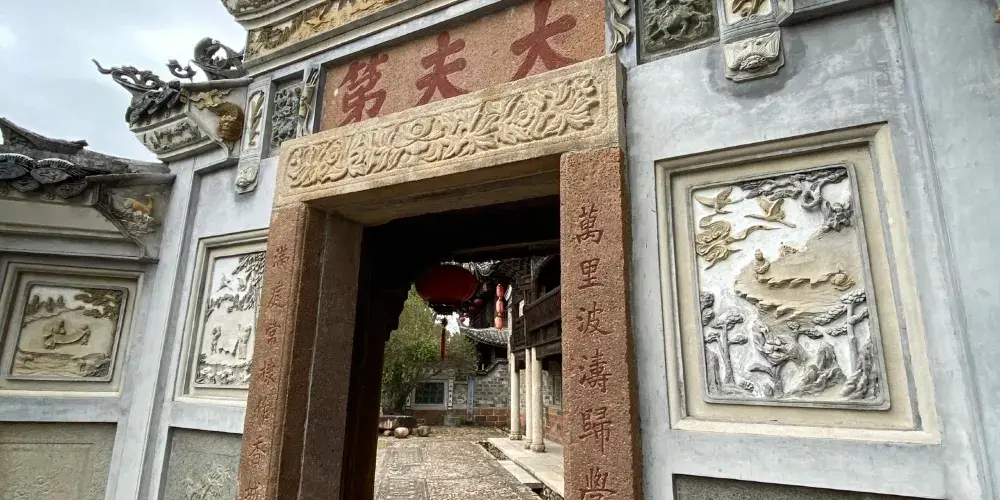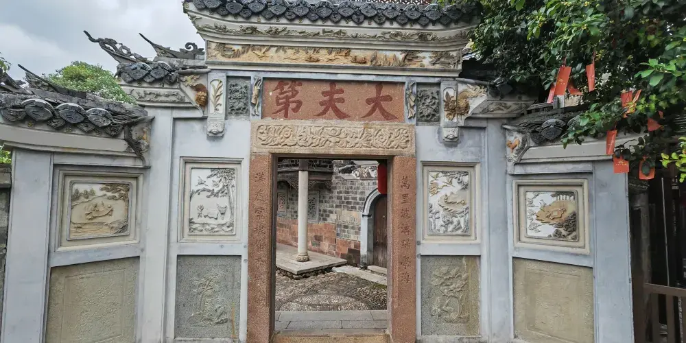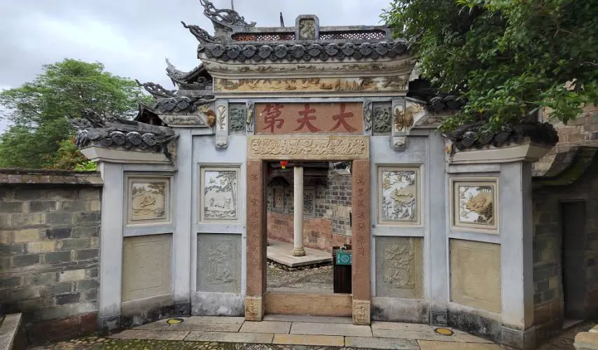 大夫第位於福建省龍巖長汀縣-環北路143-102東北方向134米。該建築為客家傳統廳堂式,按照客家背山面水房屋佈局,東臨汀江,背靠卧龍山,以大門依次進入為中軸的對稱。門樓面向東北迎水而向,入户三步台階而下,寓意為財不外流,出門步步高昇。門廳兩層,屋頂為1600多個斗拱分為五級組成,斗拱如鳳凰展翅,被稱為“五鳳樓”。