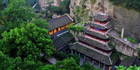 大佛寺景區位於南明山側,緊依著新昌縣城。它不只是個尋常意義上的千年古剎,而是一大片開發成熟的旅遊區。除了彌勒造像、高達5層的大佛殿,還有木化石恐龍園、雙林石窟和射雕村等十多個景點,景觀豐富。射雕村里的建築都是按照《射雕英雄傳》中的場景佈置的,你可以走進楊鐵心的老家牛家村、陸乘風的歸雲莊、丐幫軒轅台等,回味書中的情節。大佛寺西北還有千佛寺,有一千多尊形像生動的小佛像,歷史比大佛還要悠久。