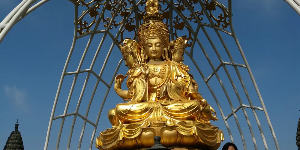 大華興寺位於深圳東部華僑城的“觀音座蓮”山上,寺廟規模宏偉,古香古色。這裡引人注目的當屬山頂那座四面觀音金像-觀音座蓮像,登頂可遠觀雲海谷,茶溪谷和大峽谷的美麗景色。寺院為唐宋時期古書院的建築風格,包含宏偉壯麗的大雄寶殿,無量雲梯,莊嚴美妙的觀音座蓮像與韋馱聖像等,展現著宗教文化內涵。