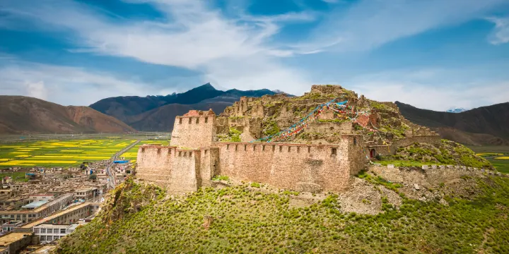 打隆寺是達隆噶舉派的祖寺,由達隆塘巴.扎西華於公元1180年(南宋淳熙七年)創建,弘傳噶舉教法。《衞藏道場勝蹟志》記載:“祥達隆塘寺內的佛教的聖蹟遺物多至不可勝計。其中較主要的是在達隆塘巴大師的茅篷內有曾經開口顯過聖的神像。大殿上層有仲敦巴大師像,像上的頭髮還在生長,如是等等非常奇特之物難以細數。”佛像建在山下的新殿內。若是都進去過就能因打隆寺石制骷髏頭而記憶格外鮮明,寺院歷經風雨顯得有些凋零,轉牆上的石制骷髏頭,牆上難以確定的石刻棋盤,大約十三世紀以前繪製的壁畫,都屬於深藏在山中小鎮上的打隆寺。一道飽和度較高的陽光斜照在寺院的黃牆上,過去的光輝依然將今日照耀,人在路上,瞬間的蒼涼入骨,偶爾參透悲歡世事。