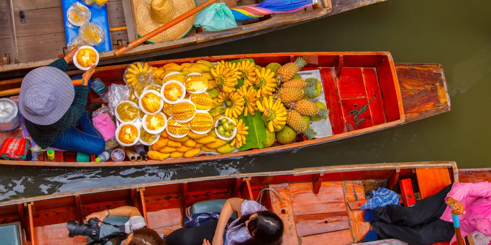 丹嫩沙多水上集市位於曼谷市西南方,距離市內車程約2小時左右。至今依然保持著泰國昔日水上集市風貌,有超過100多年的歷史,很多電影曾在這裡取景,其中著名的要屬《007》系列中的一部了。集市一般從清晨一直持續到下午2點左右,你會看到當地人帶著草帽,在兩岸熱帶樹木茂盛的運河裡,劃著載有蔬菜、水果、小商品的船在狹窄的水道裡穿梭、叫賣,儼然成為一幅曼谷生活畫卷。