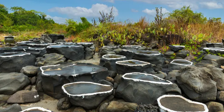 儋州千年古鹽田距今已有多年的歷史,這是早期的製鹽點之一,如今依然保留較好。景區所在的鹽田村是個海邊村莊,入村後,就可以看到海邊散落著大小不一的石槽,它們分佈在鹽田周圍,頗為壯觀,如今的鹽田村依然保留著這古老的製鹽工藝,而鹽田不遠處就是有名的洋浦港,停泊著來往的貨輪。