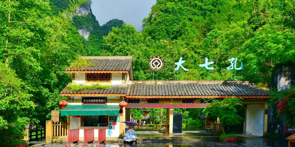 荔波大七孔景區位於荔波風景區內,因孟塘河上有一座七個孔大橋而得名。大七孔的主要看點是喀斯特峽谷和天生橋,而且有很多探險的樂趣。遊客可以在這裡乘船漂流,欣賞兩岸聳立的懸崖峭壁。絕壁上附著朵朵鐘乳、層層翠林,宛若一幅色彩斑斕的油畫。