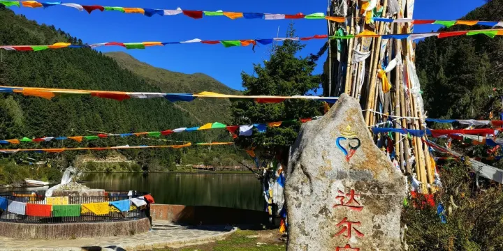 達爾宗湖海拔3100米左右,呈不規則葫蘆藤型,湖濱三面環山,湖中魚類繁生,湖畔野草叢生,百花盛開,山上森林密佈,林中百鳥羣集,湖光山色,令人陶醉。達爾宗湖是藏民心中的神湖,每年農曆的五月初四,各地藏民會來到這裏朝聖插箭,祈福迎祥。這時,整個山巒香煙繚繞,海螺聲聲,響徹雲霄。信民們手轉經輪,口誦經文,按順時針方向繞湖三週,然後投擲寶瓶,祭祀神湖,以求神靈保佑,
