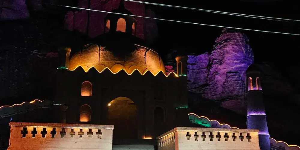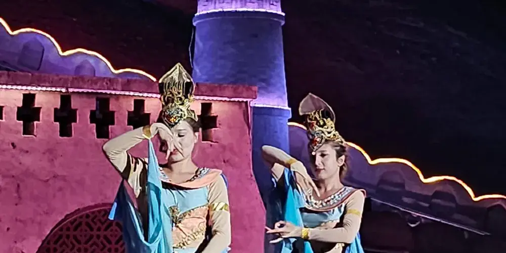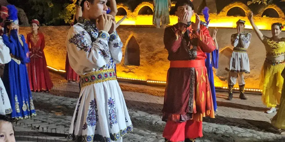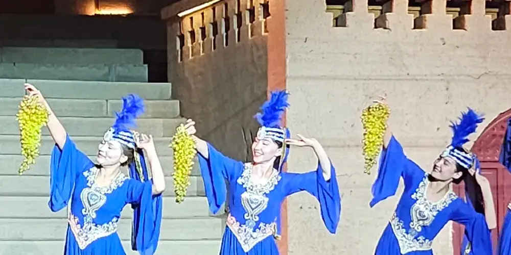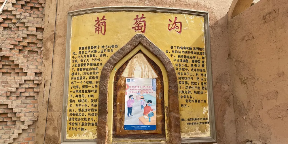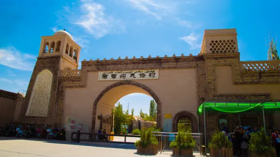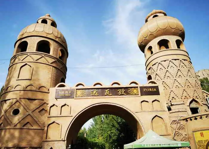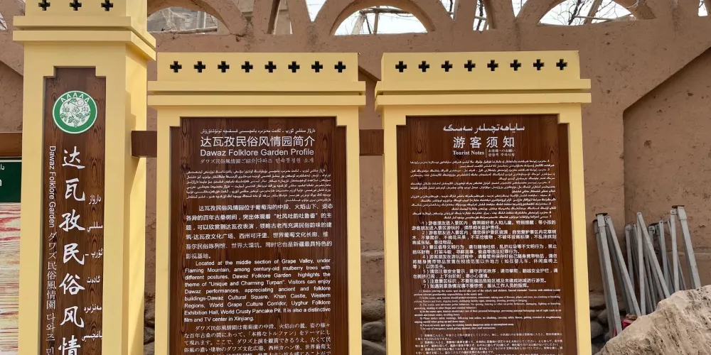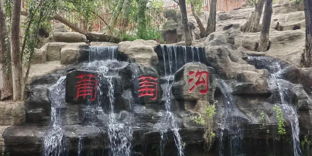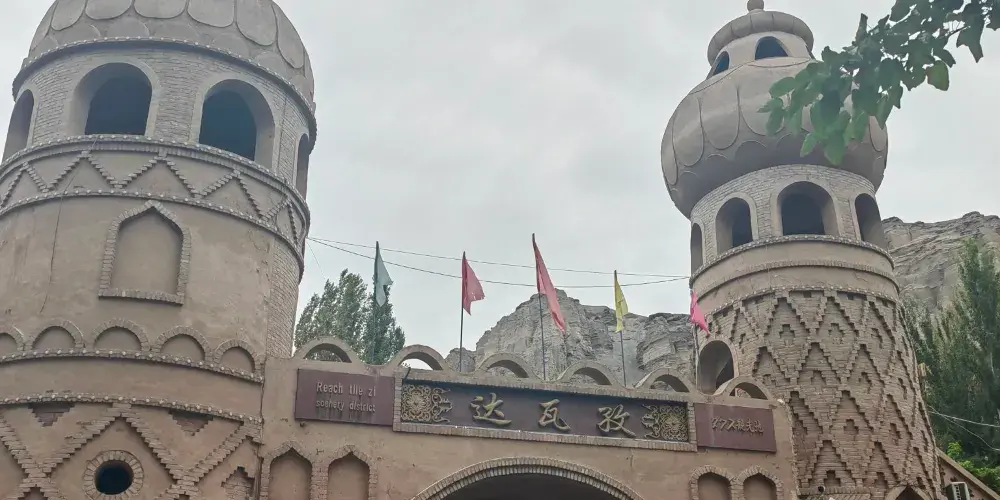 達瓦孜民俗風情園位於吐魯番地區的高昌區,就處在葡萄溝旅遊景區之內,倚靠在陡峭的火焰山斷崖,以體現“土風土韻吐魯番”為主題,復古而又充滿生機。風情園內的坎兒井溪流環繞,白楊樹綠蔭遮日,還有葡萄藤蔓層層疊疊,成熟的果實如珍珠翡翠。在民俗風情園登上觀景台,可俯瞰葡萄溝方圓百里獨特迷人的西域風光。