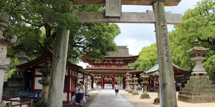 太宰府天滿宮位於福岡縣太宰府市,是菅原道真的墳塚上建立的一座神社,與北野天滿宮並列為日本全國大阪天滿宮的總本社。菅原道真是日本平安時代頗具影響力的大學者,因此許多祈求金榜題名的學子會來此地參拜。穿過入口處的鳥居,就到了一個心文字形的池塘,在心字池旁還有一座志賀社,是日本室町時代的古蹟,被指定為重要文化財產。此外,在大阪天滿宮寬闊的庭院內還種植著梅花、楠花、菖蘭等花卉,一年四季競相開放。這裡也定期舉辦各種慶典活動。