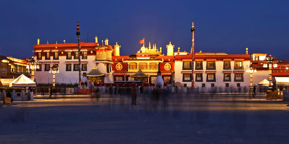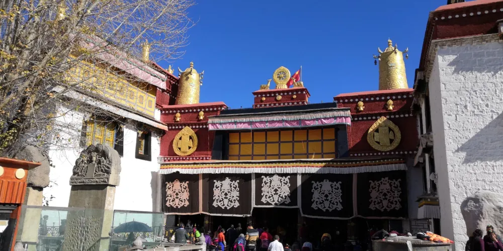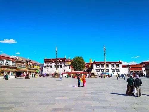 大昭寺,藏語為“覺康”,又名“祖拉康”,是藏傳佛教信徒朝拜的終點,在他們的心中,大昭寺之神聖,並不遜於布達拉宮。不論從地理位置上,還是在藏傳佛教信徒的心目中來説,大昭寺都是名符其實的藏傳佛教聖地和中心,在藏傳佛教史上擁有極其崇高而聖潔的地位。大昭寺始建於公元七世紀中葉,是藏王松贊幹布為了安放其王妃尼泊爾尺尊公主,從家鄉加德滿都帶來的釋迦牟尼8歲等身佛像而建,公元1409年,格魯派創始人宗喀巴大師在大昭寺宏揚佛法,舉行傳昭大法會,從而奠定了其在藏傳佛教史上的重要地位。公元八世紀,大唐文成公主入藏時從長安帶來的釋迦牟尼十二歲等身像供奉於大昭寺內,成為大昭寺的鎮寺之寶,是遊客及前往朝拜的人必不可錯過的看點之一。