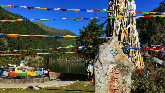 達爾宗湖海拔3100米左右,呈不規則葫蘆藤型,湖濱三面環山,湖中魚類繁生,湖畔野草叢生,百花盛開,山上森林密佈,林中百鳥羣集,湖光山色,令人陶醉。達爾宗湖是藏民心中的神湖,每年農曆的五月初四,各地藏民會來到這裏朝聖插箭,祈福迎祥。這時,整個山巒香煙繚繞,海螺聲聲,響徹雲霄。信民們手轉經輪,口誦經文,按順時針方向繞湖三週,然後投擲寶瓶,祭祀神湖,以求神靈保佑,