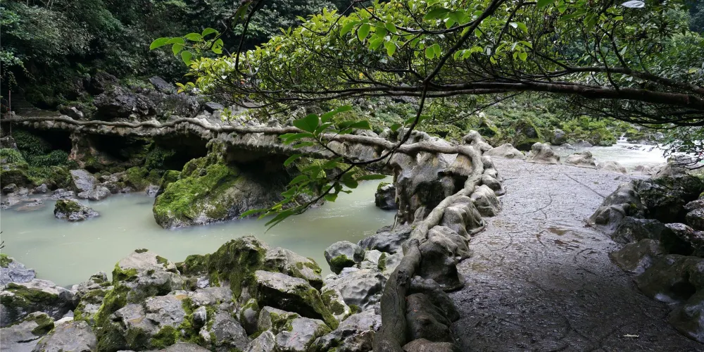小七孔古橋昔日是荔波至廣西的重要橋樑,由麻石條砌成,橋身爬滿藤蔓,古色古香。橋下是令人心醉的涵碧潭,兩岸古木參天,巨大的樹枝沿著橋面延伸,猶如巨傘一般撐在橋上。