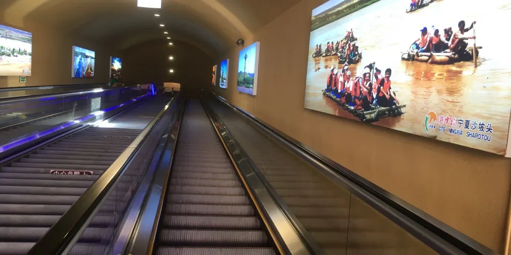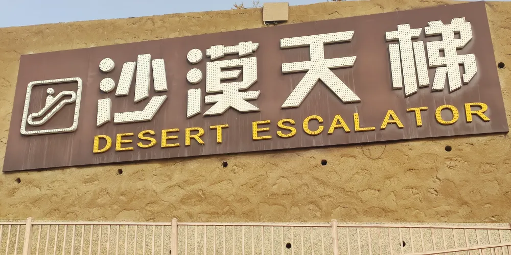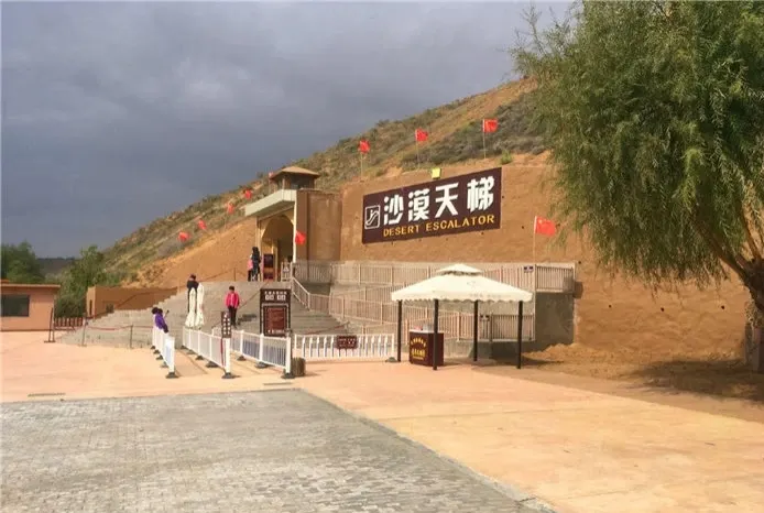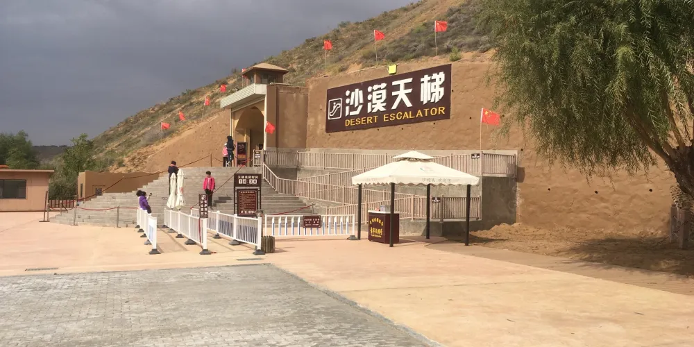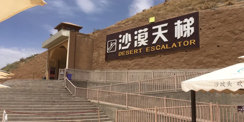 沙漠扶梯位於中衞市沙坡頭區沙坡頭南區內,建在72米高的沙坡上,分為三截,總長度達120米。乘坐長長的手扶電梯上去,就可以到達坡頂,同時還可以觀賞沙漠美景。