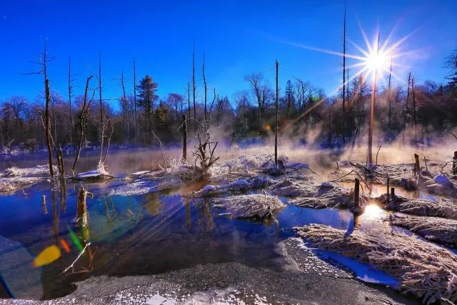 魔界風景區是位於長白山北麓的一片密林,長白山天池流瀉而下的溫泉水在這一帶形成水系,在特定的氣候環境下形成霧氣,流動於水面與林間,景象好似仙境一般。清晨是來魔界賞景的絕佳時間,尤其是冬季在霧凇襯托下會非常美。
